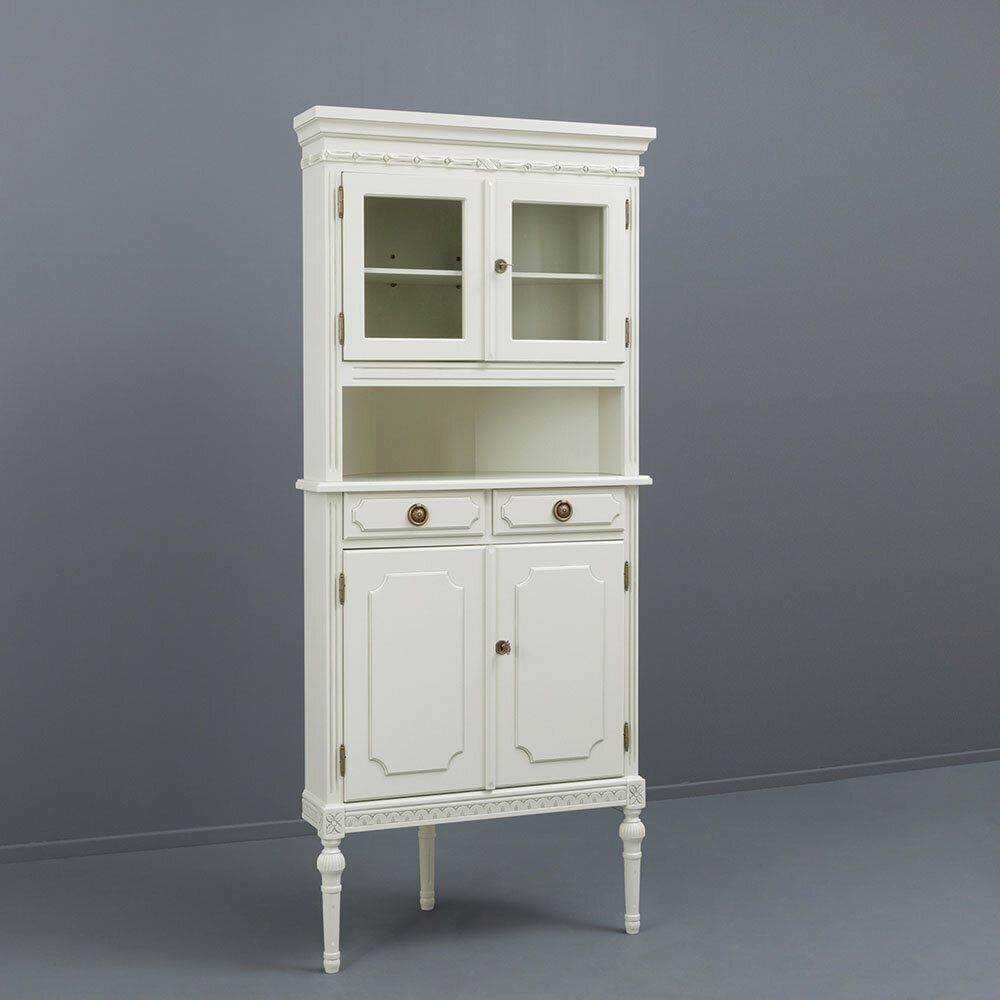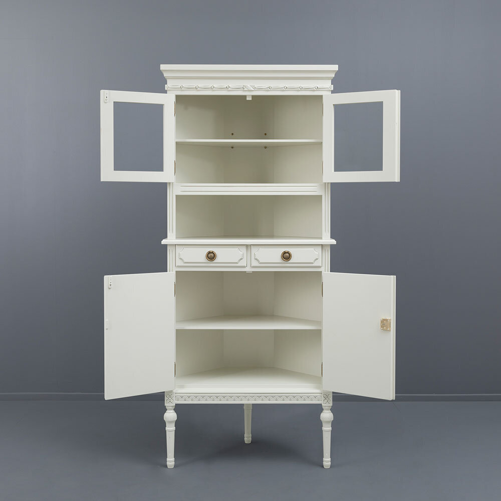 Tämä näyttävä kustavilaistyylinen nurkkakaappi hyödyntää tilan tehokkaasti ja tuo kotiisi arvokkuutta. Alaosassa on kaappi, sen päällä kaksi laatikkoa ja avohylly, sekä kaapin yläosassa vitriini kahdella hyllyllä – täydellinen yhdistelmä käytännöllisyyttä ja eleganssia.