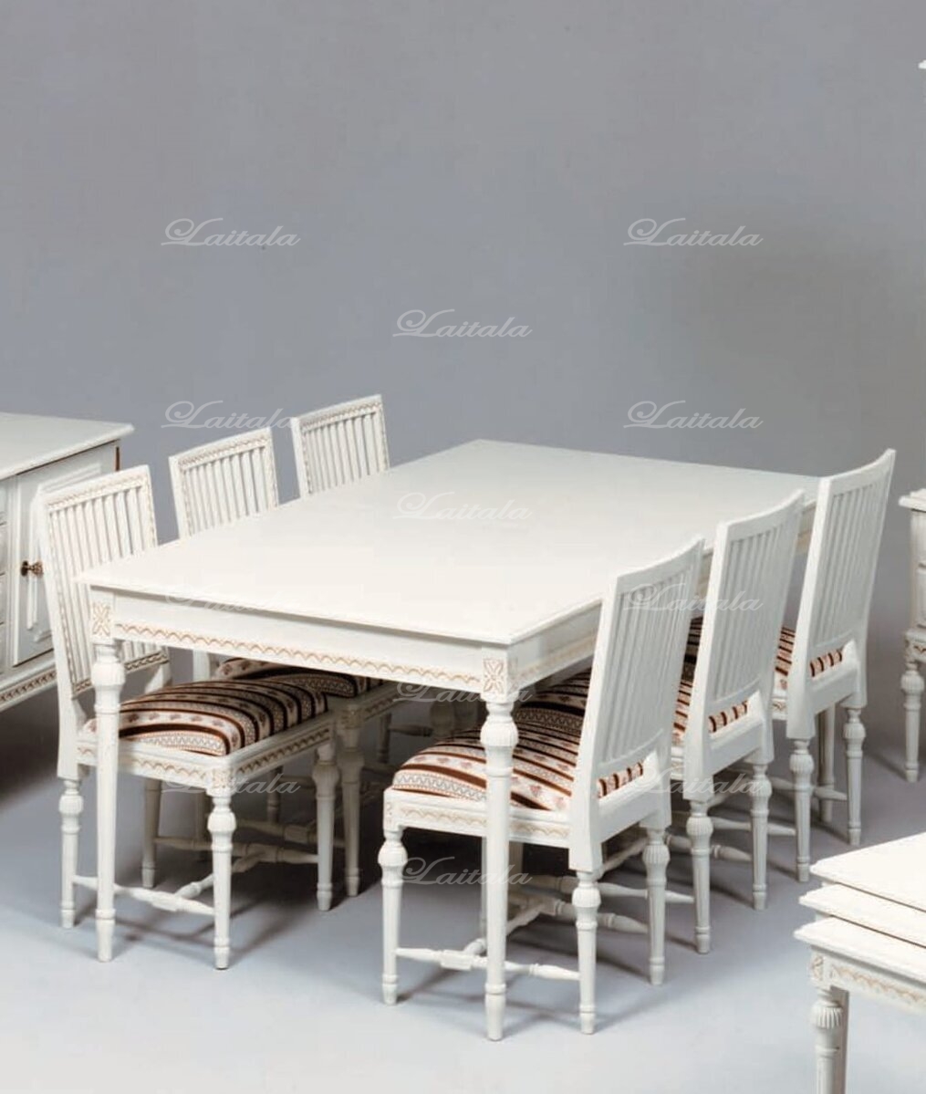 Tämä kotimainen ruokailuryhmä sisältää pöydän kahdella jatkolevyllä sekä kuusi tuolia, ja lisätuoleja on mahdollista tilata erikseen sivuiltamme lisää. Suomessa käsityönä valmistetut Kustavilaiset kalusteet edustavat ajattoman tyylikästä muotoilua ja erinomaista laatua – saatavana useissa väreissä sekä käsin maalatulla kullan- tai harmaanvärisellä patinoinnilla.