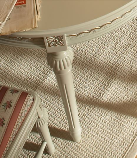 Sarjan tuotteet ovat saatavilla useissa väreissä, ja halutessasi pöytään voidaan lisätä käsin maalattu kullan- tai harmaanvärinen patinointi, joka korostaa sen elegantteja yksityiskohtia. Mikäli toivot pöytää muussa värissä, asiakaspalvelumme auttaa sinua löytämään sopivan vaihtoehdon.