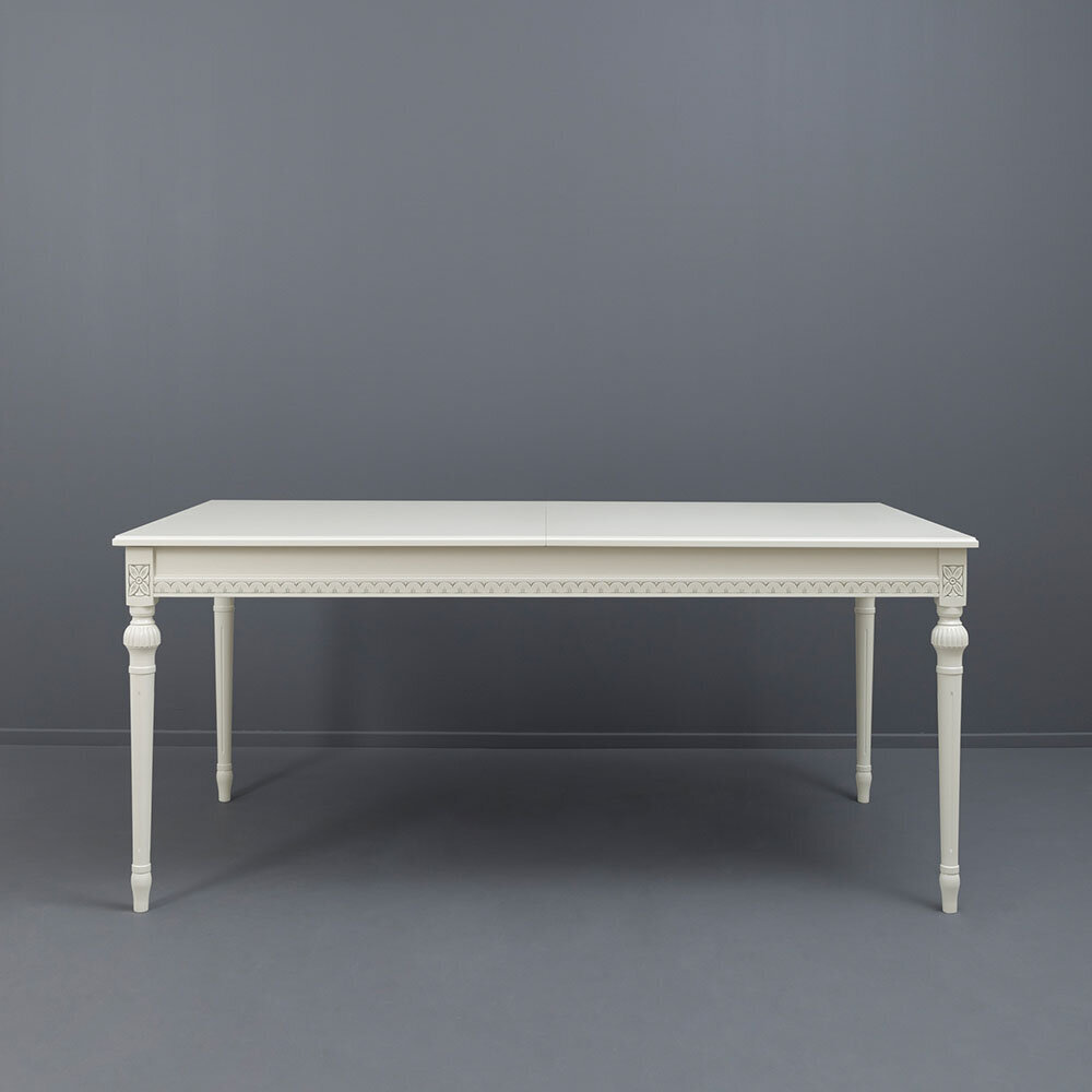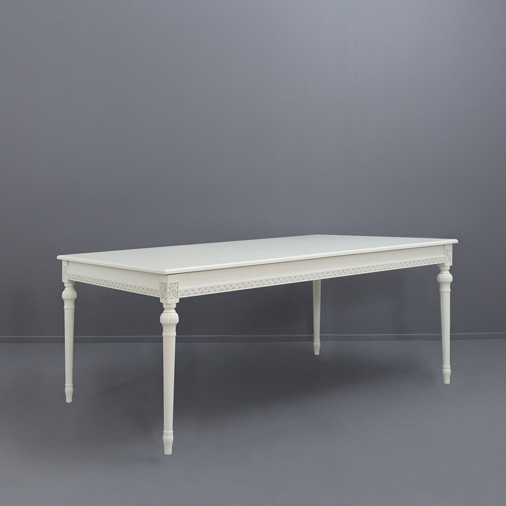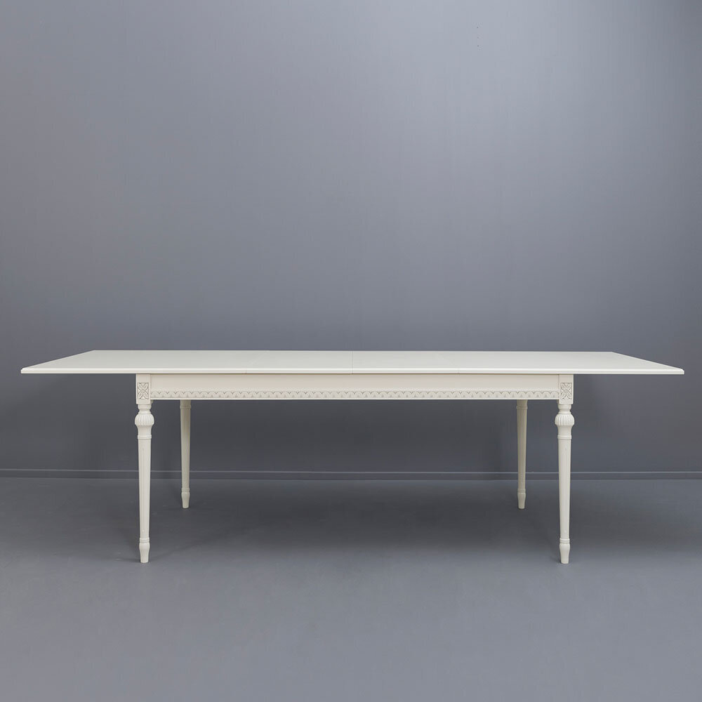 Tämä kustavilaistyylinen ruokapöytä yhdistää ajattoman kauneuden ja käytännöllisyyden. Kahden jatkopalan ansiosta pöytä mukautuu tarpeidesi mukaan, tarjoten runsaasti tilaa perheen yhteisiin hetkiin ja juhlaviin illallisiin.