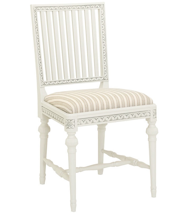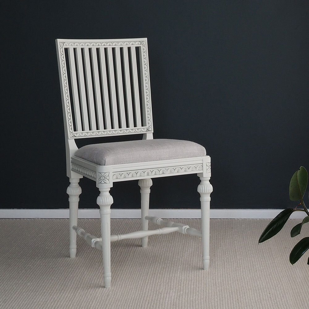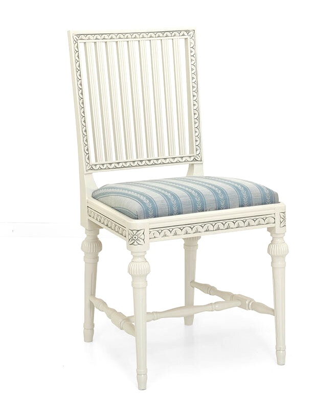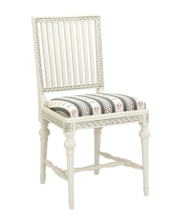 Kustavilainen tuoli tuo kotiisi hovityylin arvokkuutta ja sopii loistavasti niin ruokapöydän ääreen kuin kaapin tai lipaston molemmin puolin sijoitettavaksi. Keveän siron ilmeen luovat alaspäin kapenevat jalat, ja tukevuutta lisää englantilaisvaikutteinen H-ristikko. Näyttävä keisarinlehtikuvio selkänojassa ja istuinosassa viimeistelee elegantin kokonaisuuden.