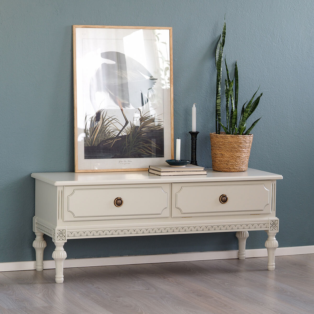 Kotimainen Kustavilainen tv-taso kahdella laatikolla – tyylikäs ja käytännöllinen ratkaisu olohuoneeseen