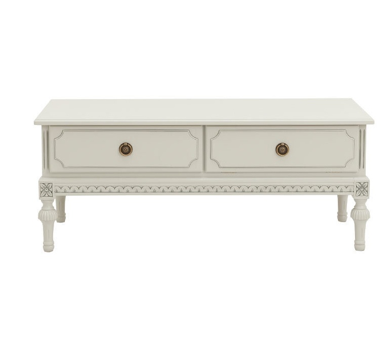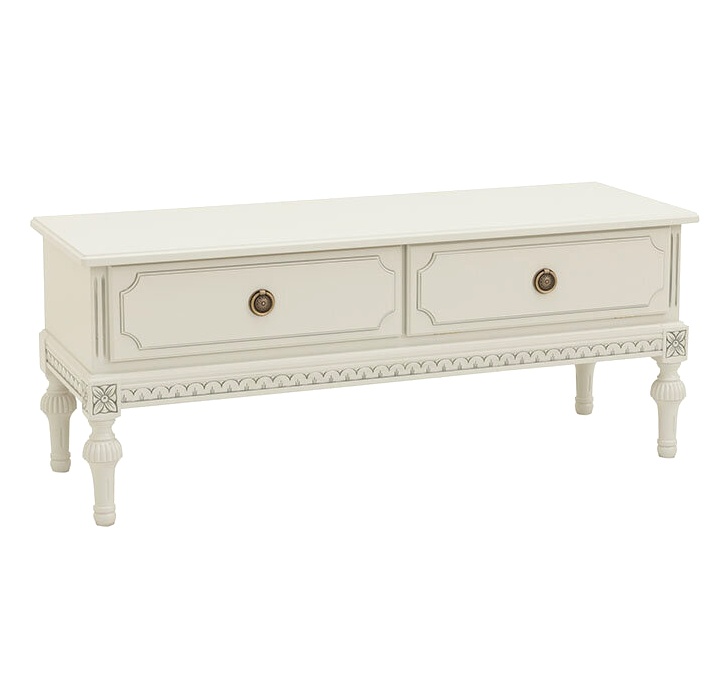 Tämä kaunis kustavilaistyylinen tv-taso yhdistää klassisen muotoilun ja kotimaisen käsityötaidon. Kahden laatikon ansiosta saat runsaasti säilytystilaa, ja taso toimii sekä käytännöllisenä että sisustuksellisena elementtinä olohuoneessasi.