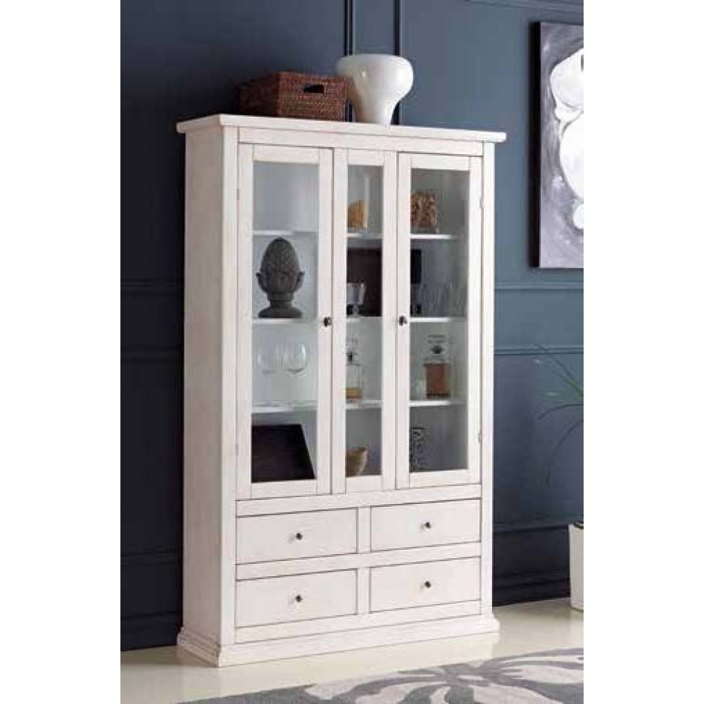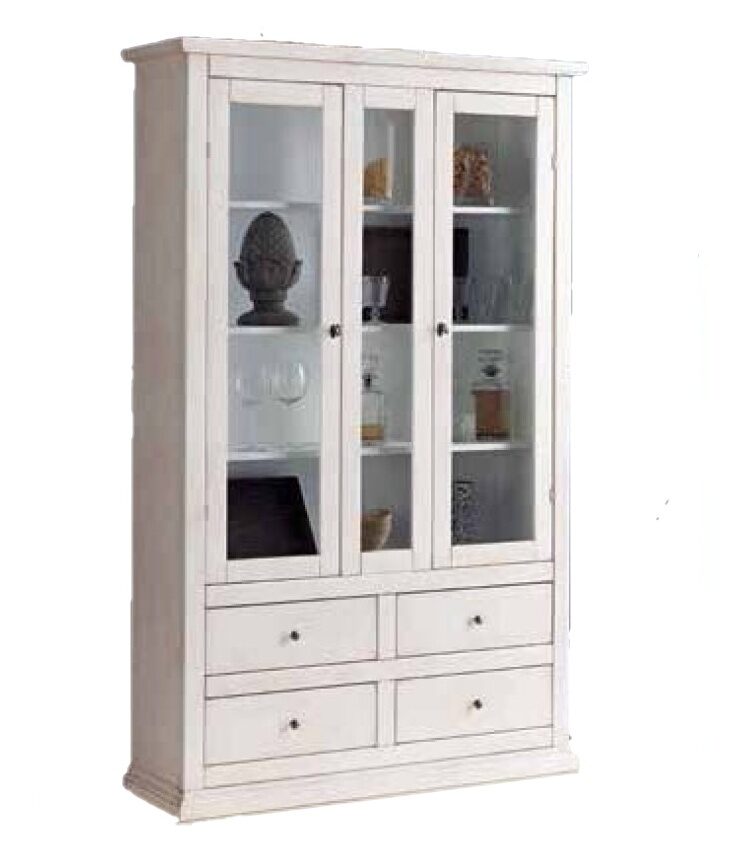 Kaksi lasiovea ja kolme tilavaa hyllyä tarjoavat runsaasti avointa tilaa esineiden kauniiseen esillepanoon, kun taas neljä vetolaatikkoa alhaalla pitävät pienemmät tavarat siististi järjestyksessä. Näin vitriini yhdistää harmonisesti sekä käytännöllisyyden että esteettisyyden.