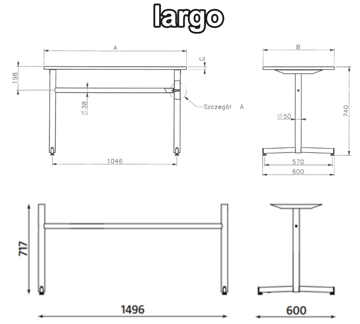 Largo-pöytiä on saatavilla lyhyellä tai pitkällä rungolla, molemmissa rungon korkeus on 74 cm, ja mittasuhteet on suunniteltu ergonomiseen työskentelyyn. Kansikoot vaihtelevat kompaktista 120×60 cm koosta aina suureen 180×80 cm pöytään, joten pöytä on helppo sovittaa tilaan ja käyttötarkoitukseen.