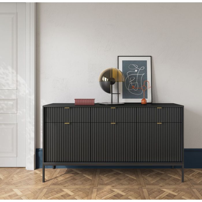Kolme vetolaatikkoa ja kolme kaappia välihyllyineen tarjoavat monipuolisen ja käytännöllisen säilytysratkaisun kaikenlaisiin kodin tarpeisiin. Leveydeltään 154 cm, syvyydeltään 39 cm ja korkeudeltaan 83 cm oleva senkki sopii täydellisesti tiloihin, joissa tarvitaan sekä tyyliä että reilusti säilytystilaa.