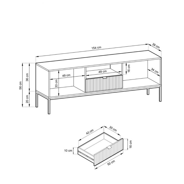 Tv-tasossa on vetolaatikko, avohylly sekä kaksi säilytyskaappia, jotka tarjoavat käytännöllisen ratkaisun laitteille ja kodin tarvikkeille. Leveydeltään 154 cm, syvyydeltään 39 cm ja korkeudeltaan 56 cm oleva rakenne sopii täydellisesti niin suuremmille televisioille kuin monipuoliselle elektroniikalle.