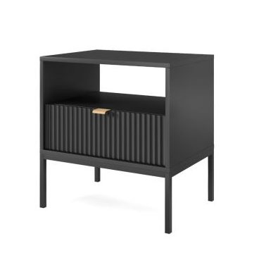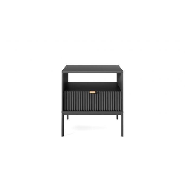 Yöpöydässä on kätevä vetolaatikko sekä avohylly, jotka tarjoavat tilaa ilta- ja aamutarvikkeille. MDF-etusarjassa olevat kauniit urat ja harjattu kullanvärinen vedin tuovat kokonaisuuteen ylellistä ilmettä ja yksilöllistä tyyliä.