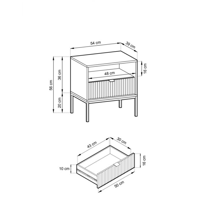 54 × 39 × 56 cm mitoitus sopii täydellisesti useimpiin makuuhuoneisiin, ja 20 cm korkeat metallijalat tuovat pöytään ilmavuutta ja tukevuutta. Toimitus osina helpottaa kuljetusta ja kokoamista.