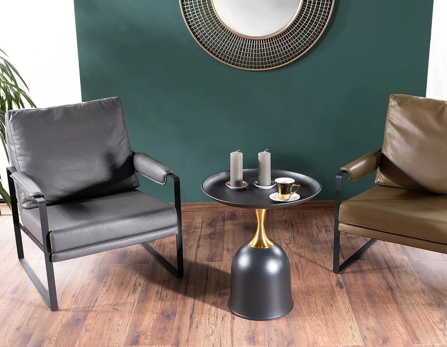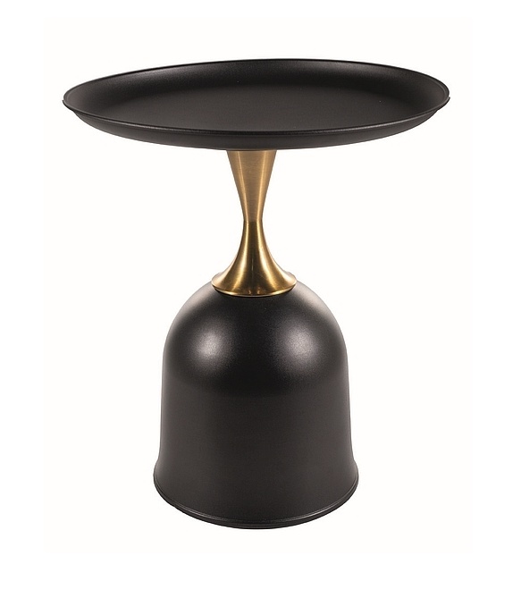 Mattamustana ja kultaisena viimeistelty metallirunko yhdistettynä mattamustaan kanteen luo ylellisen ja kestävän kokonaisuuden. Halkaisija 50 cm ja korkeus 61 cm tarjoavat täydellisen määrän laskutilaa ilman, että pöytä vie liikaa tilaa.