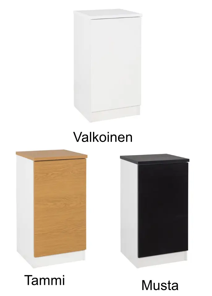 | 40.5 cm | 41 cm | 77.5 cm | cm | cm | cm | cm | cm | cm | cm | cm | cm | cm | cm | cm | cm | cm | cm | cm | cm | cm | cm | cm | cm | cm | cm | cm | cm | Kalustelevy, Mdf, Metallivetimet | Musta, Tammi, Valkoinen | cm | Korkeussäädettävät hyllyt, Ovissa ponnahdusmekanismi ( push to open) | Tilaustuote | Toimitus runko koottuna vain jalat/sokkeli ja kansi kiinnitetään | kg | Suomi | cm | cm | cm |