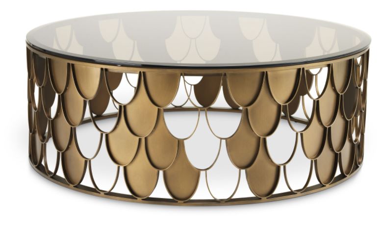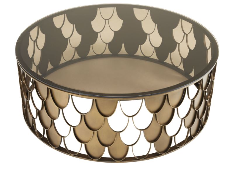 on antiikkikupariviimeistely ja siinä on keltaruskea lasipöytä. Sen muotoilu on saanut inspiraationsa Koikarpin suomusrakenteesta. Toimitus osissa.