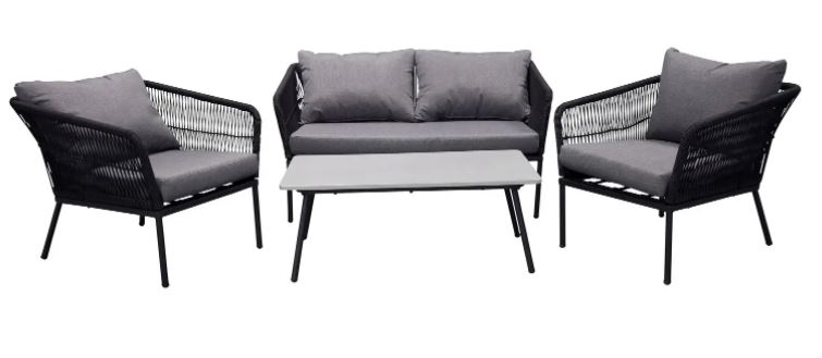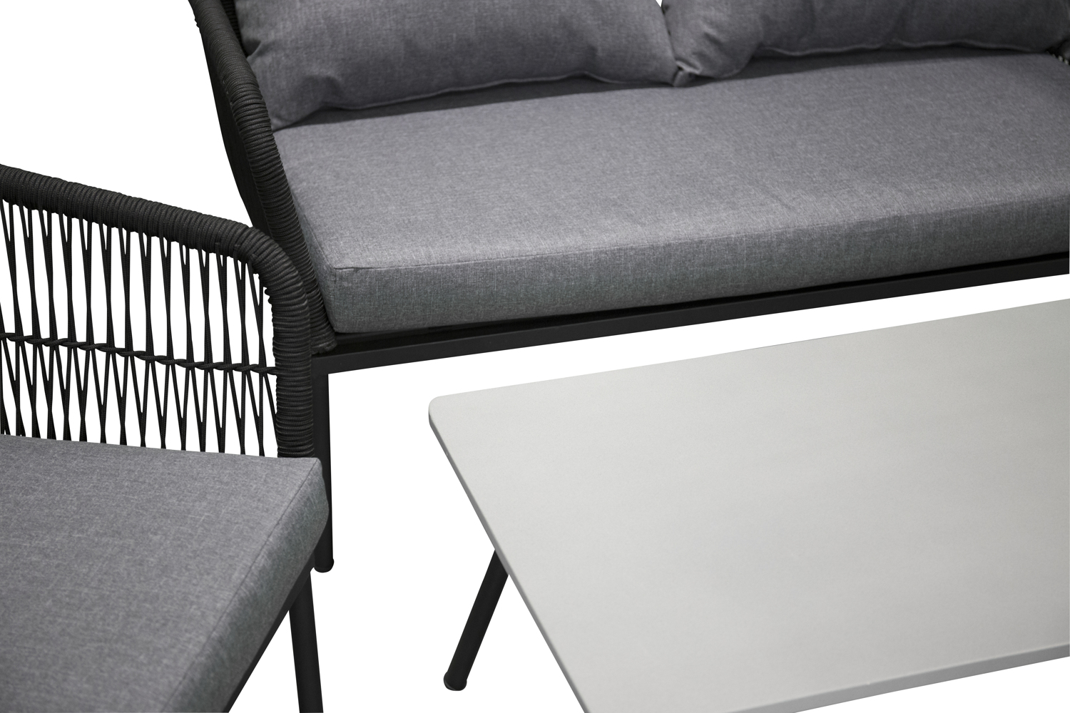 Sohvaryhmä koostuu harmaakantisesta sohvapöydästä, 2 ist sohvasta ja kahdesta nojatuolista, jotka on valmistettu mustasta jauhemaalatusta metallirungosta. Sohvan ja nojatuolien sivut ja selkänoja on tyylikkäästi punottu mustasta köydestä. Pehmeät paksut harmaat tyynyt sisältyvät tuotteisiin.