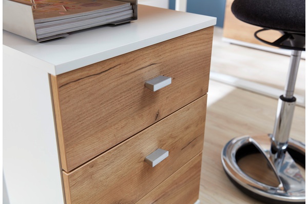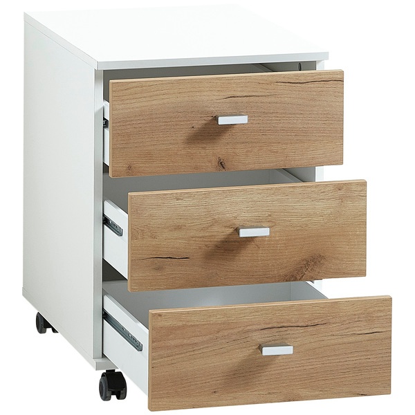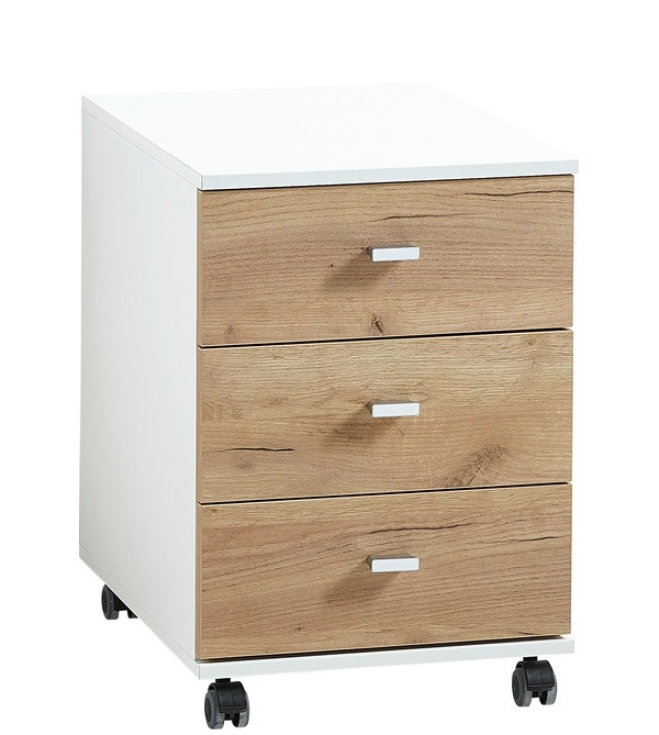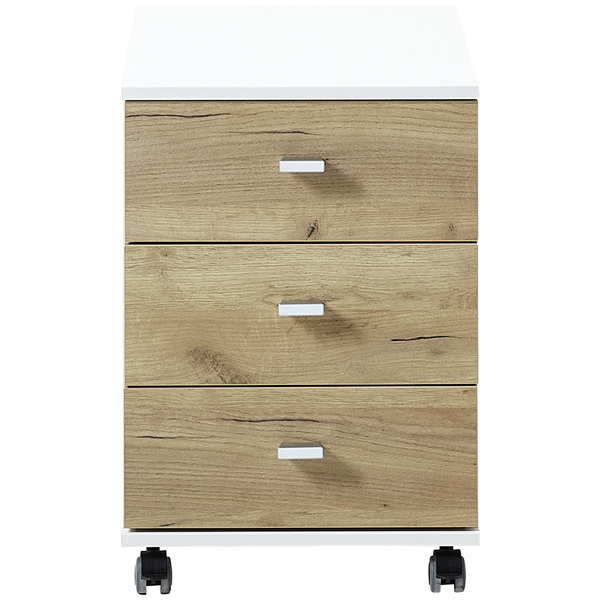Lioni lipasto pyörillä 4151 yhdistää modernin valkoisen ja lämpimän Navarra-tammen sävyt, tuoden tilaan eleganttia ilmettä ja harmonista skandinaavista tunnelmaa. Sen selkeälinjainen design sopii erinomaisesti työhuoneeseen, makuuhuoneeseen tai mihin tahansa tilaan, jossa kaivataan sekä tyyliä että toimivuutta.
