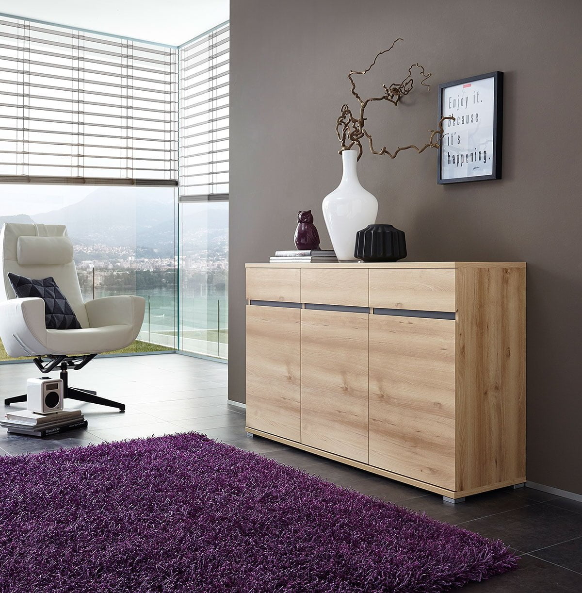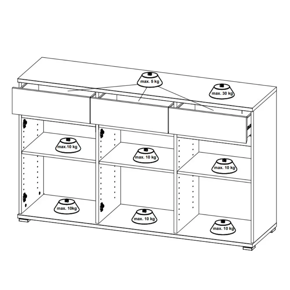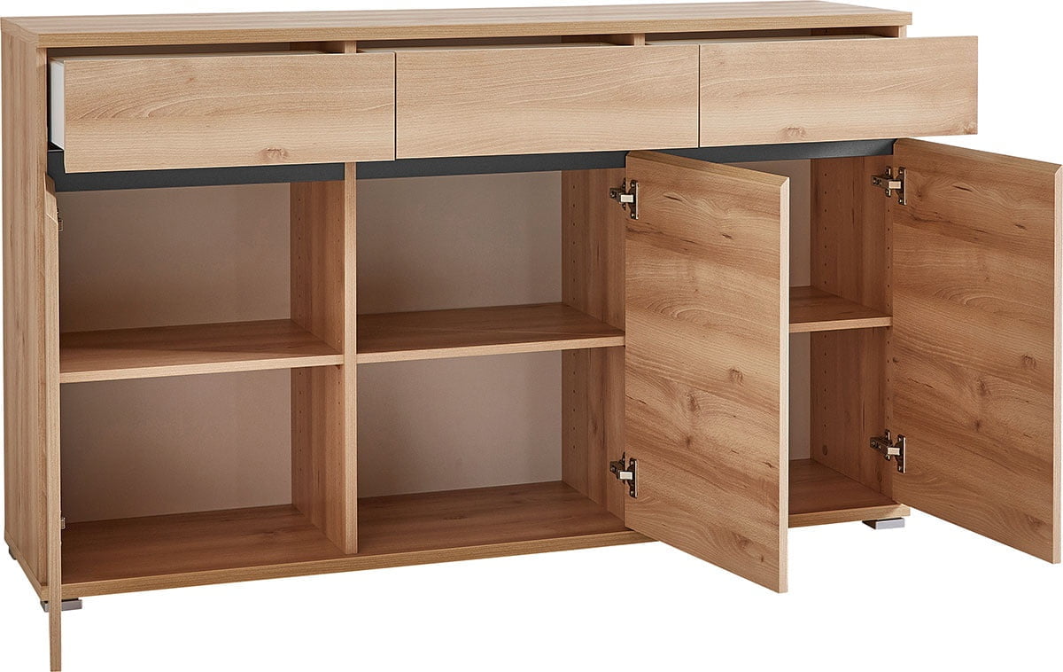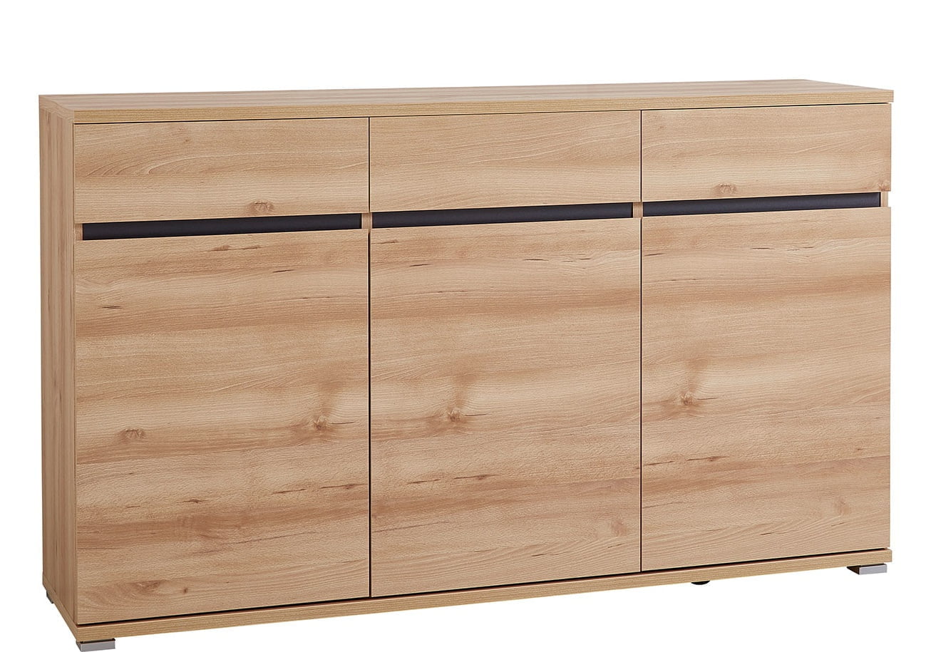 Kolme tilavaa laatikkoa ja kolme ovea, joiden takana on korkeussäädettävä hylly, tarjoavat runsaasti joustavaa säilytystilaa. Senkki pitää tavarat siististi järjestyksessä ja sopii täydellisesti olohuoneeseen, ruokailutilaan tai makuuhuoneeseen.