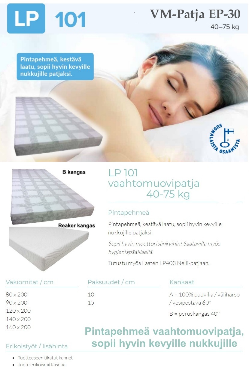 LP101-patja on tilattavissa kahdessa paksuudessa (10 cm tai 15 cm) ja useilla verhoiluvaihtoehdoilla: kestävä polyesterikangas tai hengittävä puuvillakangas. Kevyt, pintapehmeä ja monikäyttöinen patja sopii erinomaisesti lasten sänkyyn tai moottorisänkyyn.