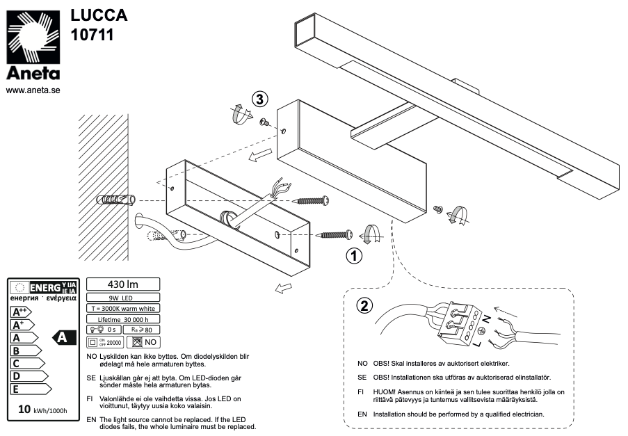 IP44-suojaus tekee Lucca seinävalaisimesta erinomaisen valinnan kosteisiin tiloihin. Integroidut LED-polttimot tarjoavat tasaisen ja miellyttävän valaistuksen, joka sopii erityisesti peilin yhteyteen tai yleisvaloksi seinäpinnalle.