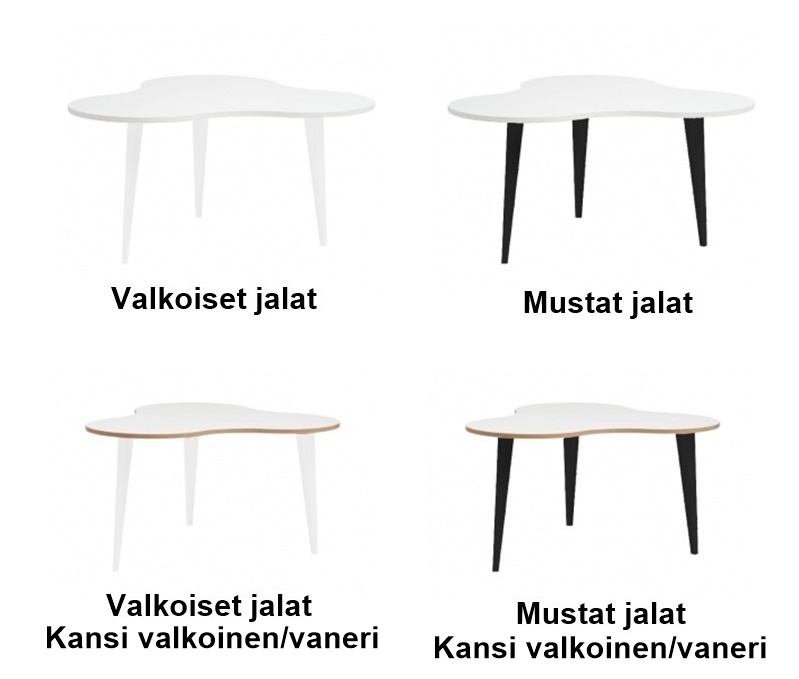 Valitse suosikkisi neljästä viimeistellystä vaihtoehdosta – musta, valkoinen, musta tammireunalla tai valkoinen tammireunalla. Jokainen sävy korostaa pöydän eleganttia muotoilua ja antaa mahdollisuuden sovittaa se täydellisesti omaan sisustustyyliisi.