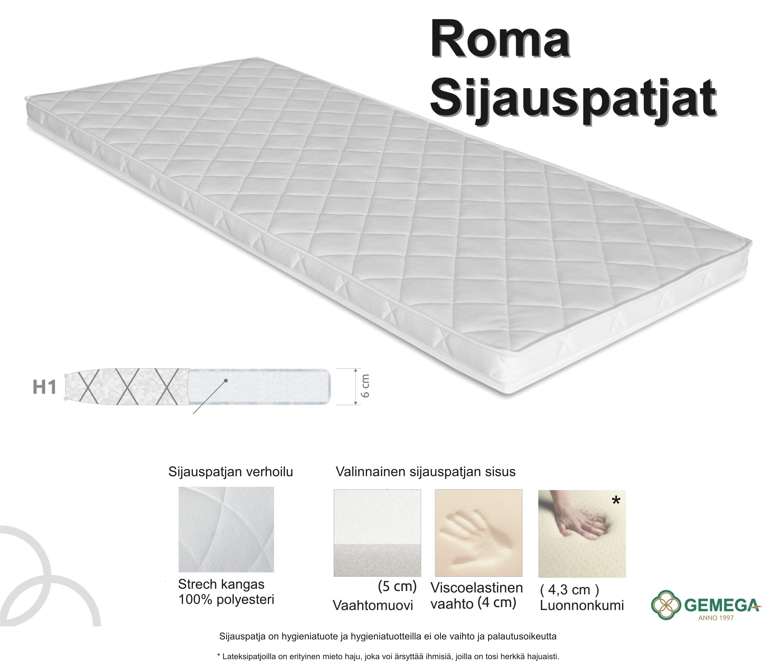 Suosittelemme lisäksi sijauspatjansuojaa, joka suojaa patjaa lialta ja pidentää sen käyttöikää – saatavilla lisätarvikkeista. Roma-Latex -sijauspatjan päällinen on tikattu, irrotettava ja vesipestävä 60 °C:ssa.Viimeistele kokonaisuus Uniluoto-peitolla ja tyynysetillä – ylellistä mukavuutta jokaiseen yöhön. Mahdollista tilata kuvan runko joustinpatjalle lisätarvikkeista