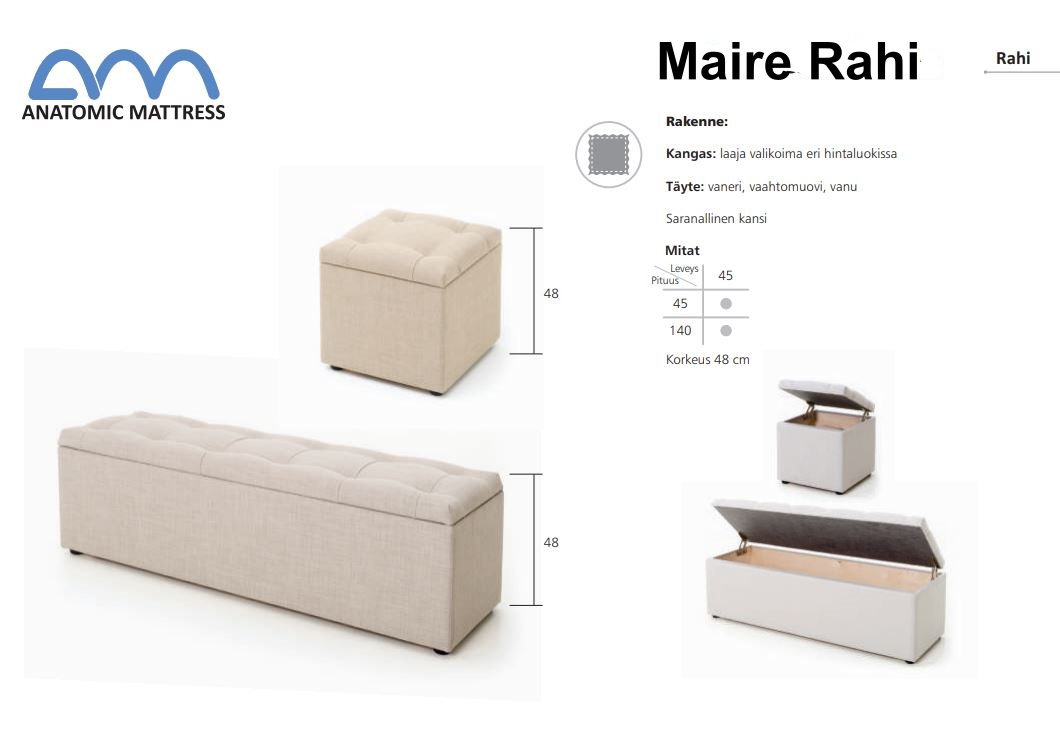 Maire-penkki on toimiva ja tyylikäs säilytysratkaisu olohuoneeseen tai makuuhuoneeseen, tarjoten kätevän paikan päiväpeitoille ja muille arjen tarvikkeille. Penkki toimii yhtä hyvin sängynpäädyn edessä kuin lisäistuimena oleskelutilassa, yhdistäen käytännöllisyyden ja siistin ulkonäön.