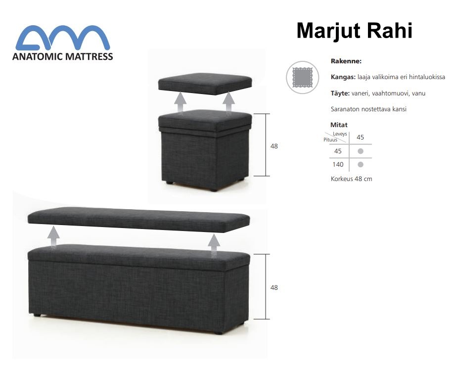 Monikäyttöinen säilytys ja istuin Marjut-penkki säilytystilalla 140 on käytännöllinen ja tyylikäs ratkaisu olohuoneeseen tai makuuhuoneeseen, tarjoten reilun säilytystilan päiväpeitoille ja muille tarvikkeille. Penkki toimii samalla mukavana istuimena esimerkiksi sängynpäädyssä tai eteisessä.