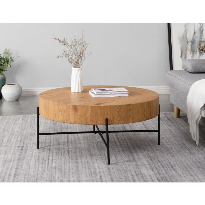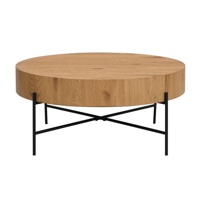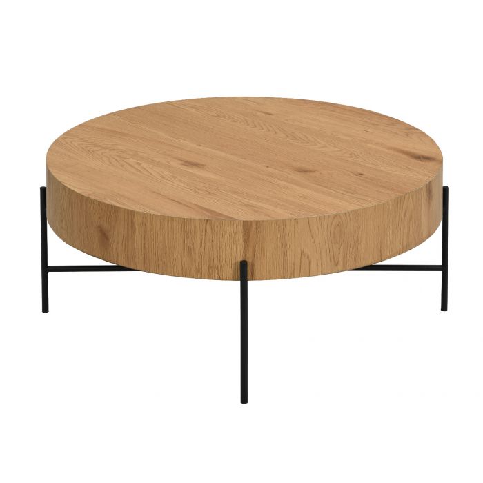 Mason-sohvapöytä tuo olohuoneeseen kevyen ja tyylikkään ilmeen sirojen mustien metallijalkojen ja tammenvärisen paperipinnoitetun MDF-kannen ansiosta. Sen kauniin selkeälinjainen muotoilu sopii täydellisesti sekä moderniin että skandinaaviseen sisustukseen ja antaa tilaan luonnollista lämpöä.
