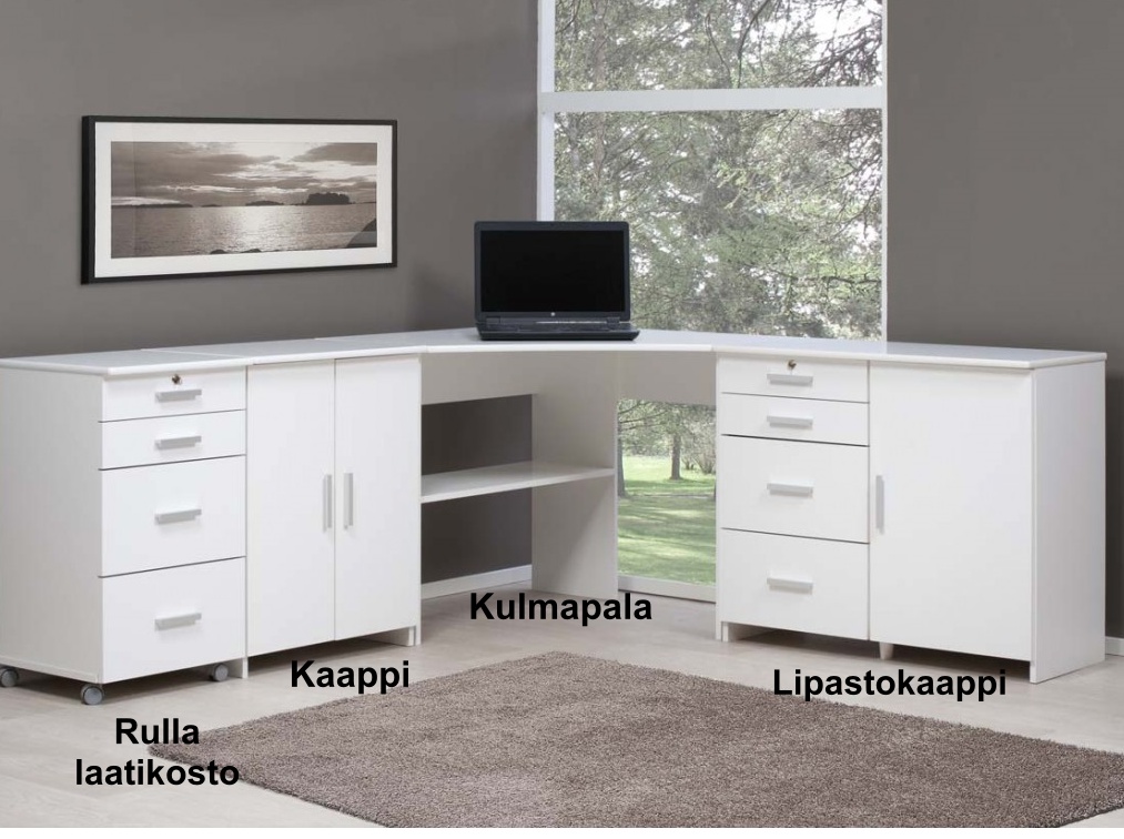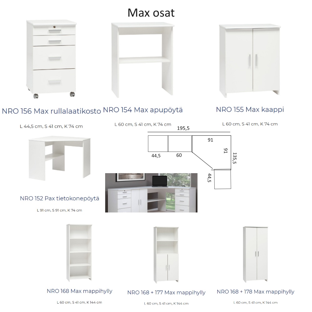 Luo tehokas ja toimiva työpiste Max-kulmakirjoituspöydällä, joka yhdistää kotimaisen laadun, monipuolisuuden ja tyylikkään muotoilun. Kulmamallin ansiosta pöytä hyödyntää tilan maksimaalisesti, ja voit koota juuri omaan tarpeeseesi sopivan kokonaisuuden avohyllyillä, kaapilla tai rullalaatikostolla.