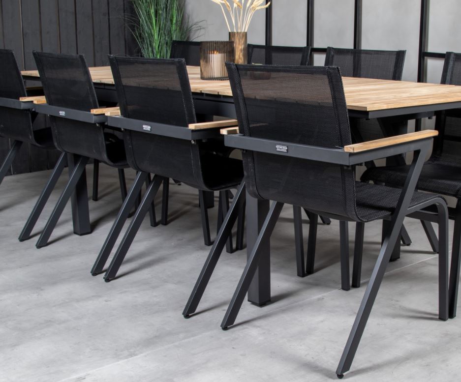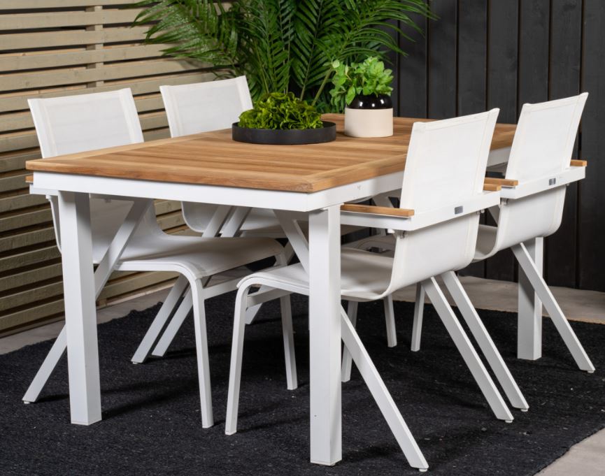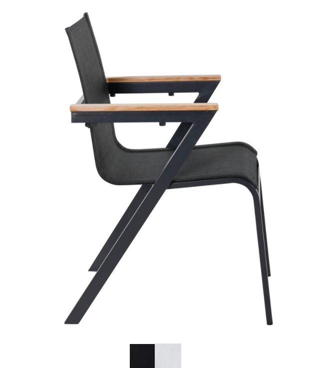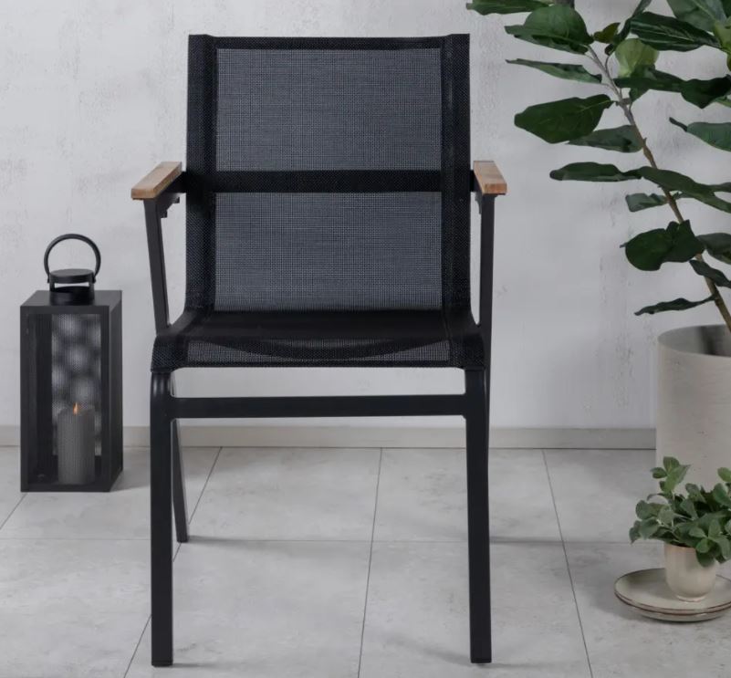 Mexico-sarjan laadukas tuoli, jonka voit yhdistää moneen ruokapöytään. Käsinojat on valmistettu tiikistä luomaan mukavan yksityiskohdan yksiväriseen istuimeen. Tuolit ovat pinottavia, joten niiden säilytys on helppoa. Runko alumiinia ja istuin Textilene kangasta. Textilene on synteettinen kangas, joka on valmistettu PVC-käsitellystä polyesteristä. Materiaali on vedenpitävä ja UV-käsitelty. Tällä tuolilla luot lisää tyylikästä viihtyvyyttä terassillesi.