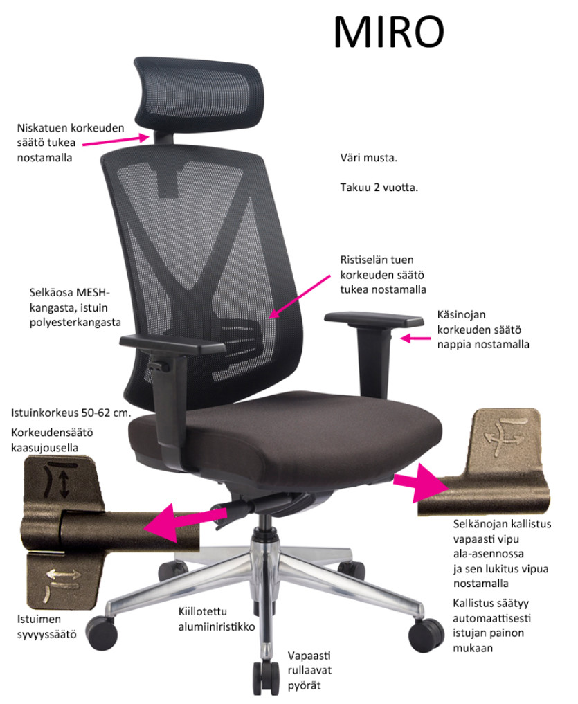 Miro-työtuoli tarjoaa hengittävän Mesh-selkänojan, säädettävän niskatuen ja monipuoliset mekanismisäädöt, joiden ansiosta löydät vaivattomasti juuri sinulle sopivan työasennon. Tuoli sopii sekä toimistoon että kotitoimistoon, tarjoten mukavuutta pitkäänkin työpäivään.