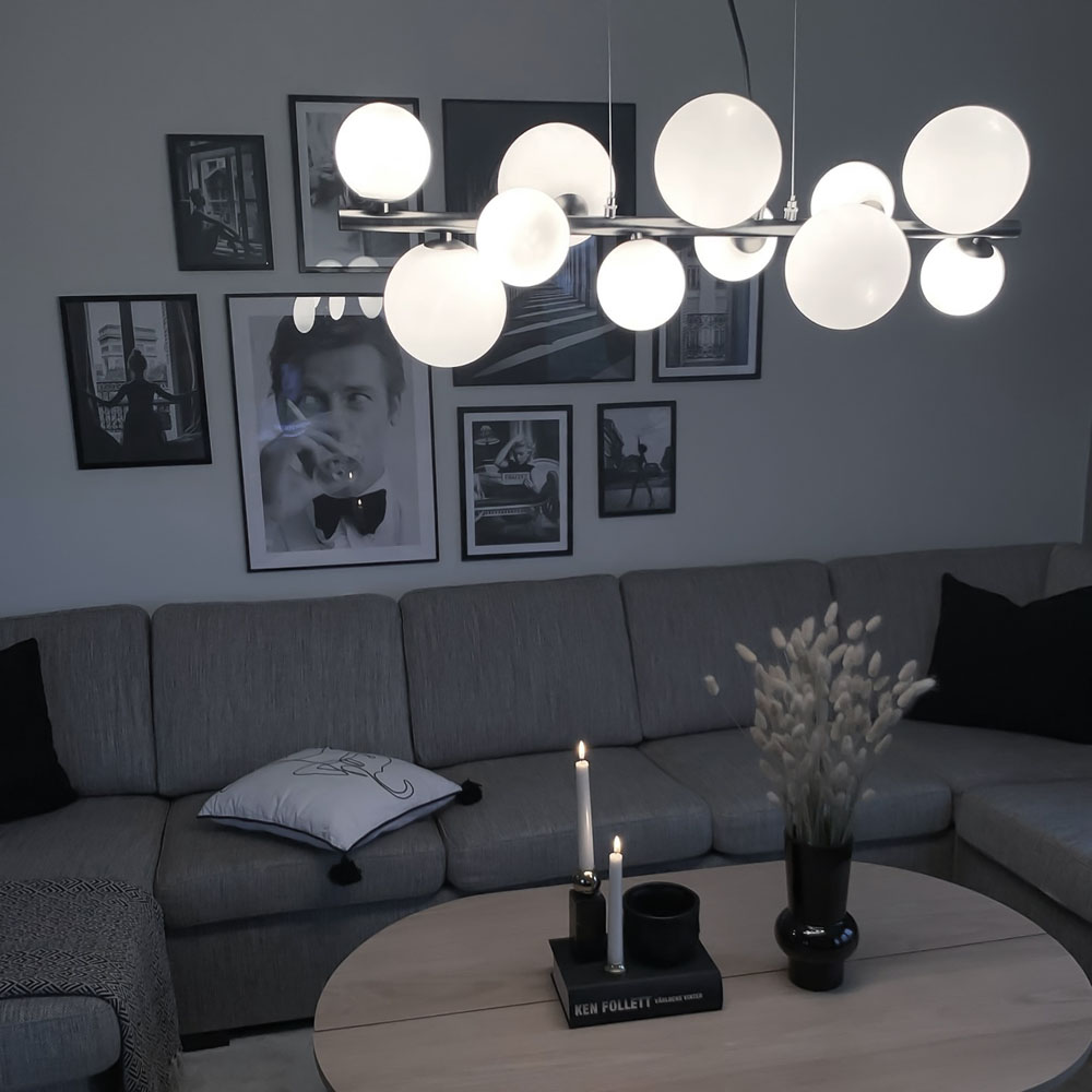 Yksitoista lasikupua jakavat valon kauniisti koko tilaan, luoden pehmeän mutta tehokkaan valaistuksen. Molekyl-11 riippuvalaisin sopii erinomaisesti ruokailutilan, olohuoneen tai aulatilan keskipisteeksi, jossa valaisin saa toimia myös näyttävänä sisustuselementtinä.