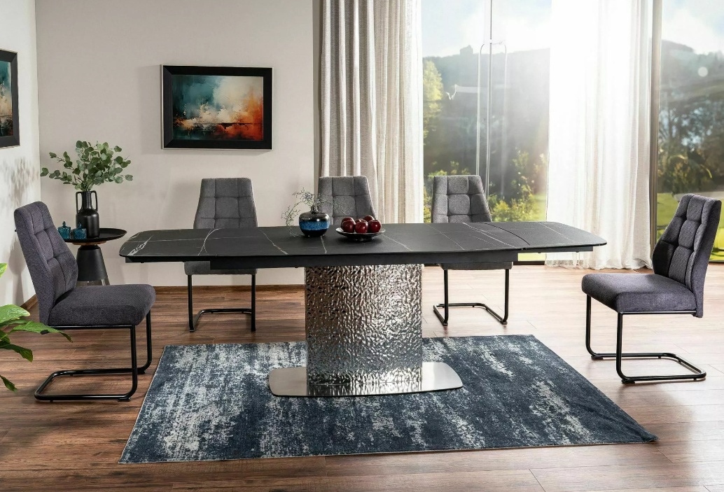 Moncler Sahara Noir -ruokapöytä on modernin sisustuksen näyttävä keskipiste, jossa mattamusta marmorikuvioitu pinta ja tyylikkäästi muotoiltu jalka luovat ylellisen ja viimeistellyn kokonaisuuden. Sen harmoninen ulkonäkö antaa ruokailutilalle arvokkuutta ja tuo tilaan modernia eleganssia.