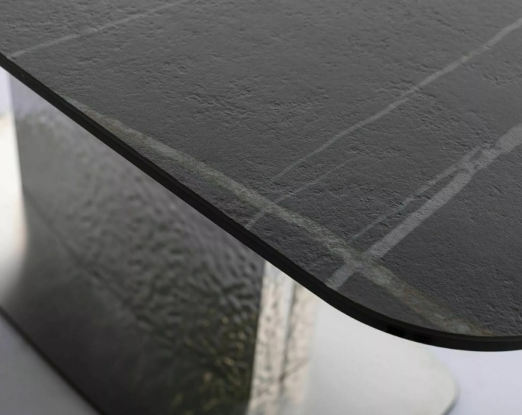 Karkaistu lasi ja Sahara Noir -keramiikka yhdistettynä ruostumattomaan teräkseen takaavat pitkäikäisen ja tukevan rakenteen. Materiaalien huolellinen valinta tekee pöydästä helppohoitoisen ja varman investoinnin, joka kestää käyttöä vuodesta toiseen.