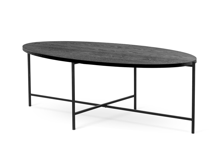Sohvapöydän kansi on valmistettu mustaksi petsatusta saarnesta, joka tuo pintaan syvyyttä ja arvokasta ilmettä. Musta metallinen ristikkojalka luo pöydälle kevyen mutta tukevan rakenteen ja viimeistelee modernin, hieman teollishenkisen kokonaisuuden.