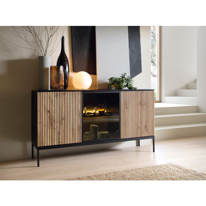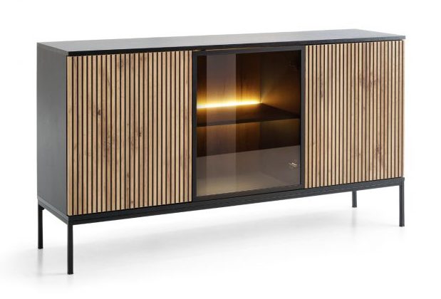 Mooa-senkki tuo sisustukseen ylellistä tunnelmaa lämpimän sävyisen LED-valaistuksensa ansiosta, joka korostaa kalusteen modernia ilmettä. Musta 16 mm laminoitu runko, ABS-reunanauha sekä uritetut 18 mm MDF-ovet ja keskiosan 4 mm karkaistu savulasi muodostavat laadukkaan, viimeistellyn kokonaisuuden.