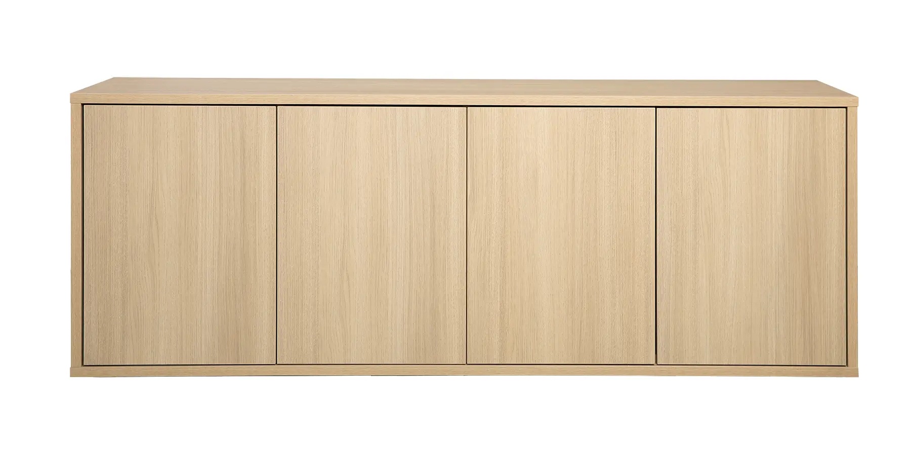 Neljä push-to-open ovea avautuvat kevyesti painamalla, ja niiden takana olevat säädettävät hyllyt tarjoavat runsaasti säilytystilaa pienestä koostaan huolimatta. Selkeälinjainen muotoilu ja huolellinen viimeistely tekevät tasosta katseenvangitsijan kodin eri tiloihin.
