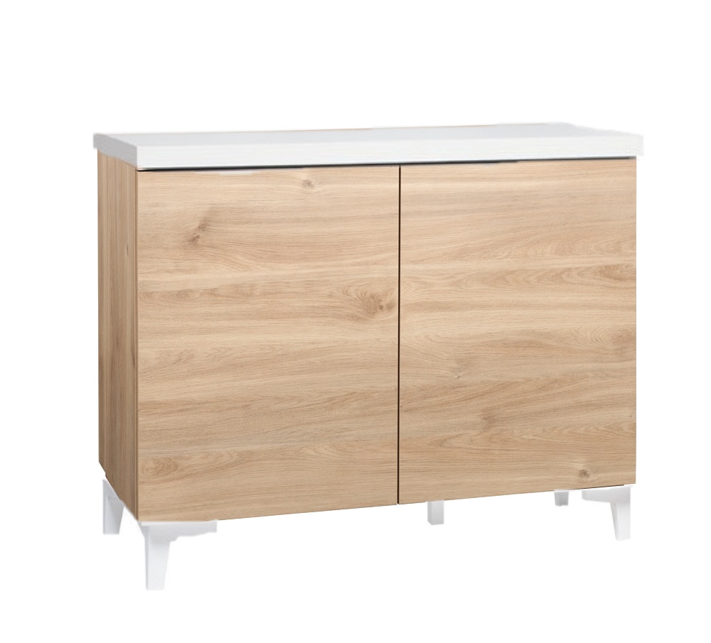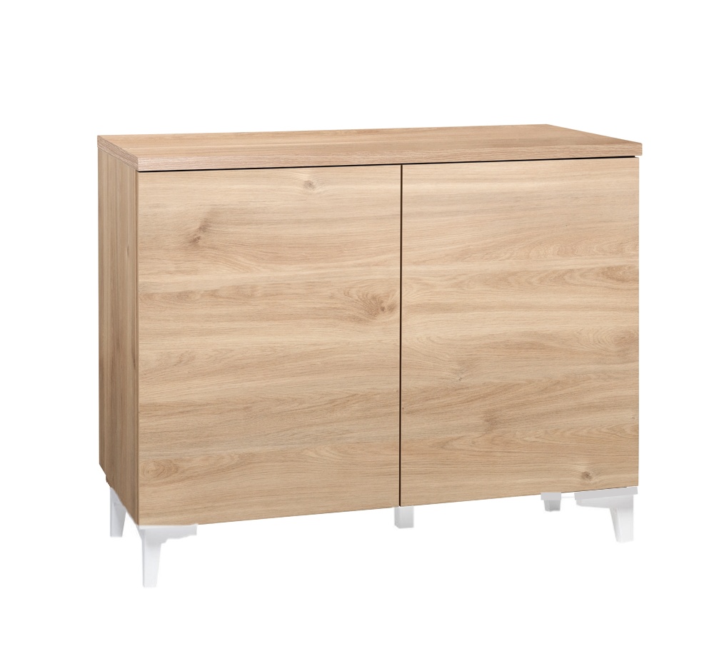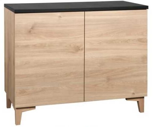 Rakenne on tehty vahvasta kalustelevystä, ja kannen voit valita joko hunaja tammesta tai mustasta tai valkoisesta maalatusta MDF-levystä – molemmat vaihtoehdot tarjoavat tyylikkyyttä ja pitkäikäisyyttä. 13 cm korkeat massiivipuiset jalat antavat kaapille kevyen, ilmavan ilmeen ja tekevät sen sijoittamisesta helppoa eri tiloihin. Jalat voit valita joko tammen tai valkoisen värisenä