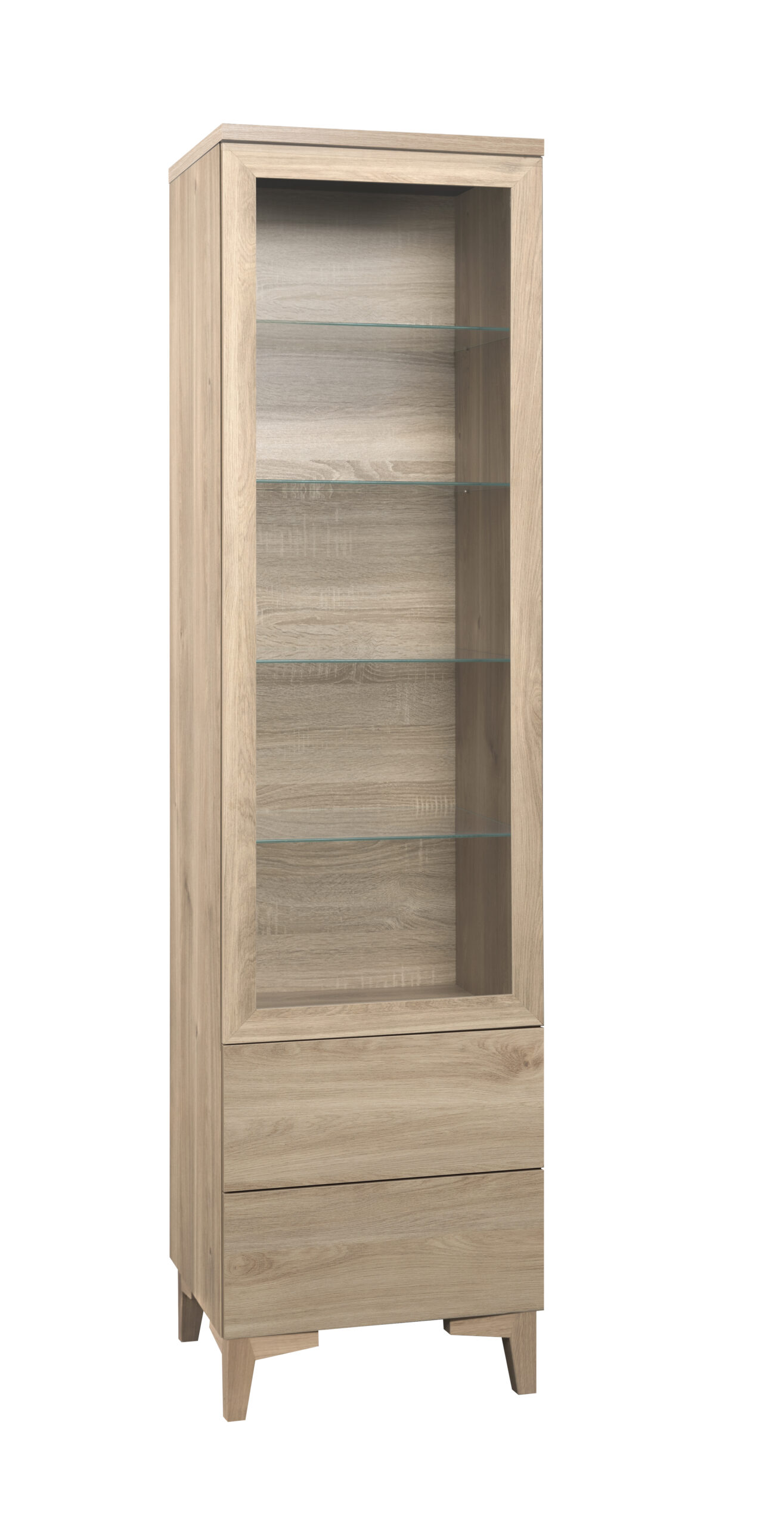 Lasiovi, lasihyllyt tai puuhyllyt ja kaksi laatikkoa push-open mekanismilla tarjoavat runsaasti tilaa niin koriste-esineille kuin käytännön säilytykseen. Mekanismi tekee avaamisesta kevyttä ja helppoa, säilyttäen vitriinin selkeän, minimalistisen ilmeen.