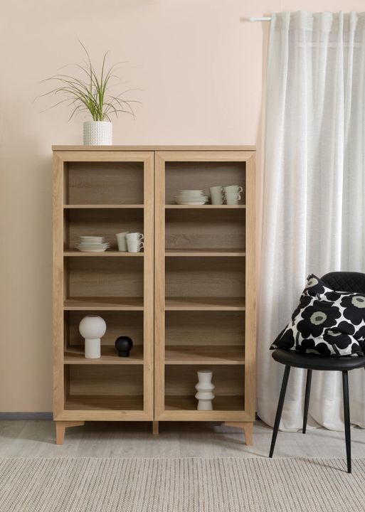 Vitriini tarjoaa korkeussäädettävät lasi tai levyhyllyt, jotka mukautuvat helposti erilaisiin säilytystarpeisiin – oli kyseessä astiat, kirjat tai koriste-esineet. Push-open mekanismi ovissa tekee käytöstä vaivatonta ja säilyttää kalusteen virtaviivaisen, vetimettömän ilmeen.
