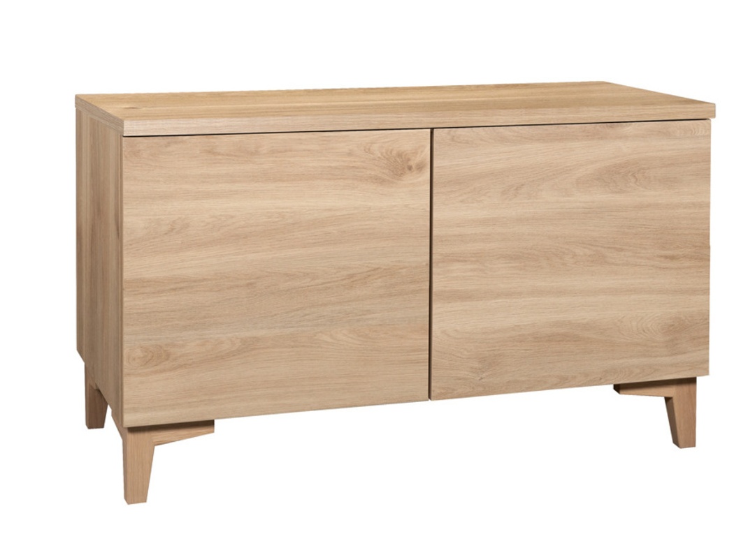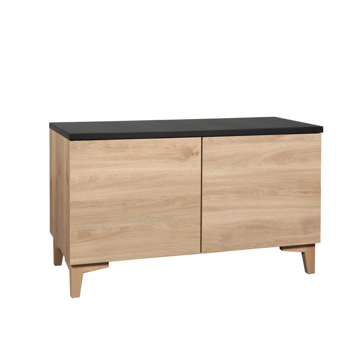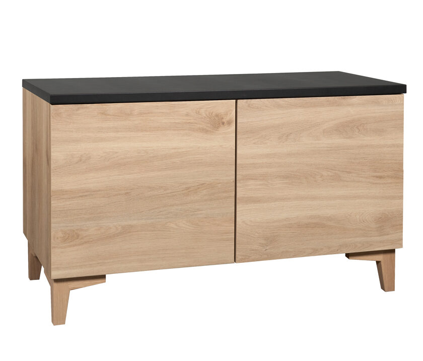 Kestävästä kalustelevystä valmistettu runko ja etusarjat takaavat pitkäikäisyyden, ja hunaja tammen tai mustan maalatun MDF-kannen valinta antaa mahdollisuuden muokata kaapin ilmettä omaan sisustustyyliin sopivaksi. 13 cm korkeat massiivipuiset jalat tuovat kalusteeseen ilmavuutta ja tekevät siivoamisesta helppoa. Jalat voit valita joko tammen tai valkoisen värisenä