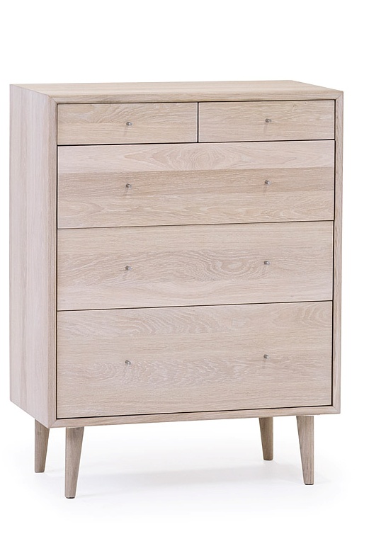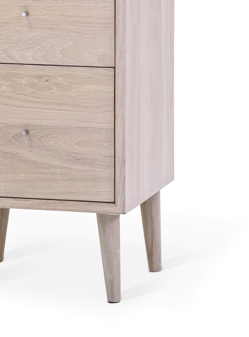 Lipastossa on viisi laatikkoa: kolme leveää ja kaksi pienempää, mikä mahdollistaa tavaroiden selkeän jaottelun ja käytännöllisen säilytyksen. Kauniit hopeanväriset metallivetimet ja soft-close-mekanismi tuovat arkeen käyttömukavuutta, ja sorvatut massiivitammijalat viimeistelevät laadukkaan kokonaisuuden.