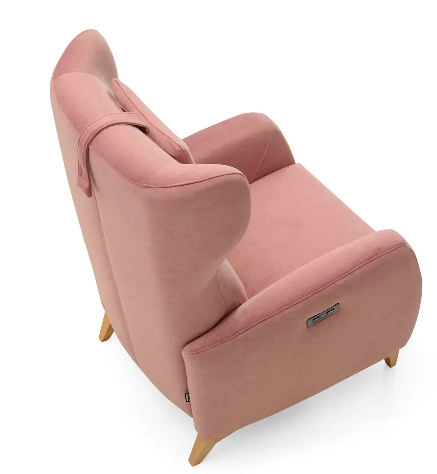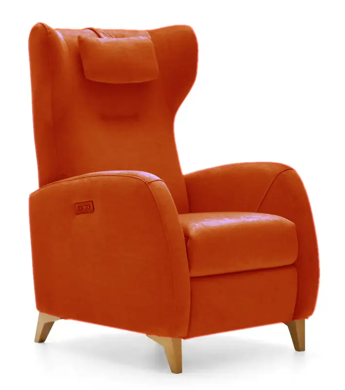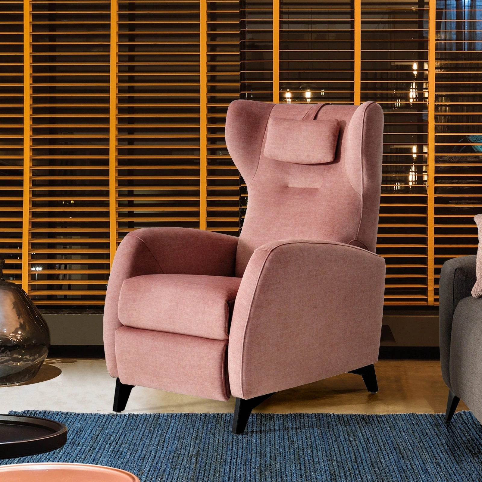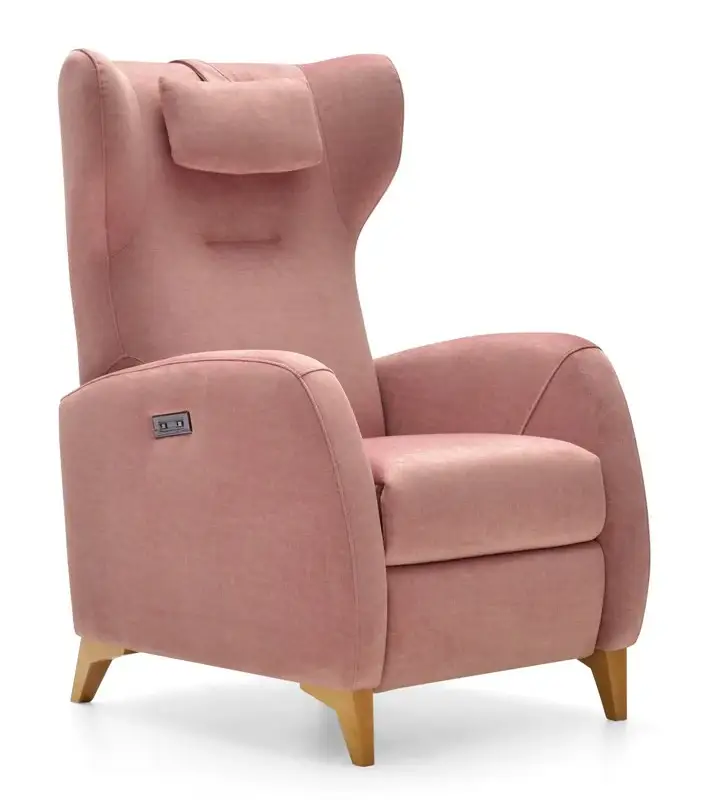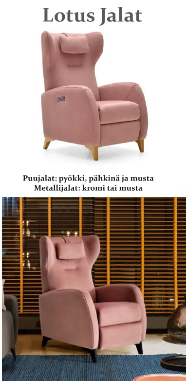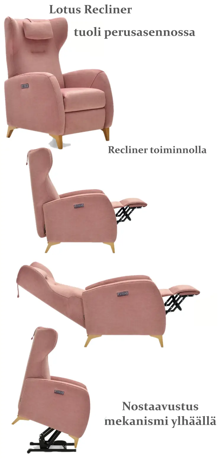 Lotus-recliner yhdistää perinteisen nojatuolin siivekkeineen moderniin nostoavusteiseen teknologiaan, tarjoten sekä ajattoman ulkonäön että helpon käytettävyyden. Säädettävä niskatyyny ja leveä selkänoja luovat täydellisen ympäristön rentoutumiselle ja ergonomiselle istuma-asennolle.