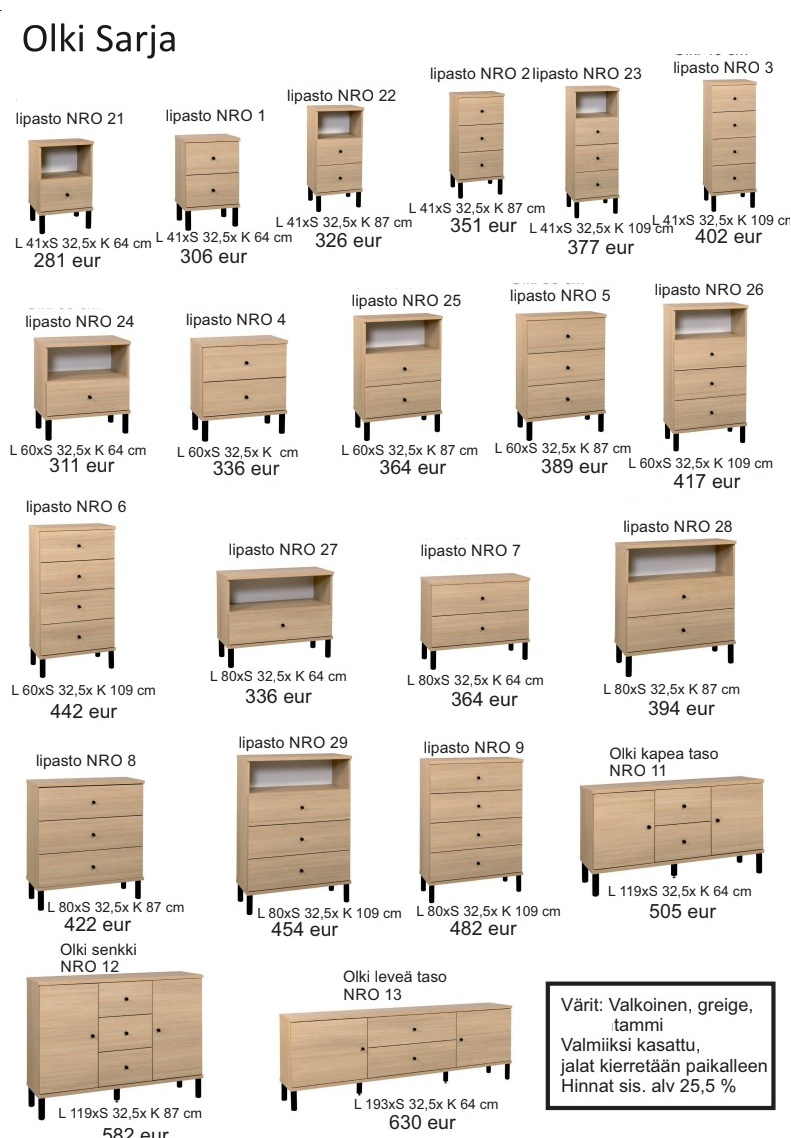 Olki-sarjan kalusteet on suunniteltu erityisesti kapeisiin ja ahtaisiin tiloihin, joissa jokainen senttimetri on tärkeä. Normaalia pienempi syvyys tekee näistä laatikostoista täydellisen valinnan esimerkiksi eteiseen, käytävään tai pieneen olohuoneeseen. Suosittelemme kiinnittämään kalusteen seinään kaatumisen estämiseksi, mikä lisää turvallisuutta arjessa.
