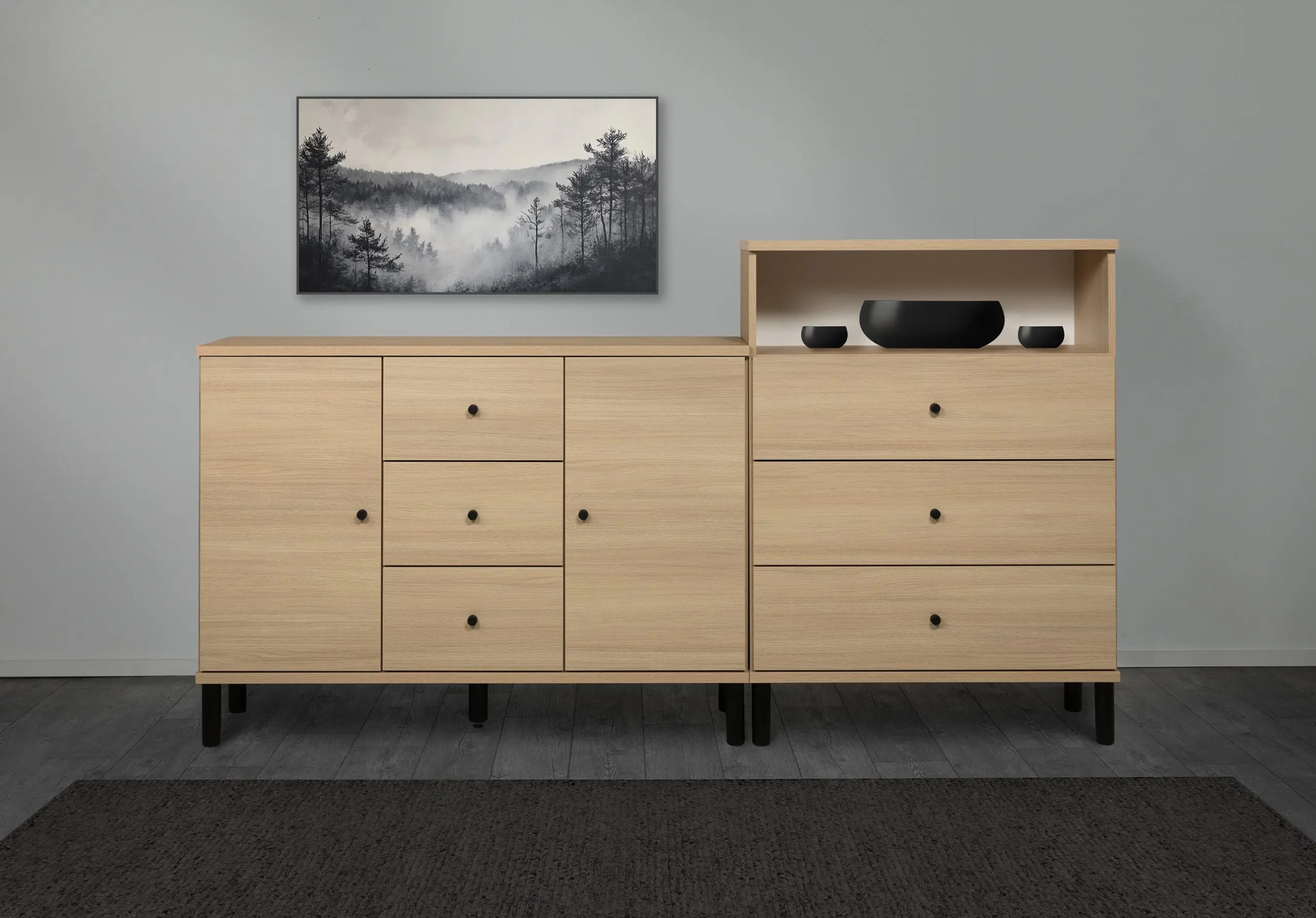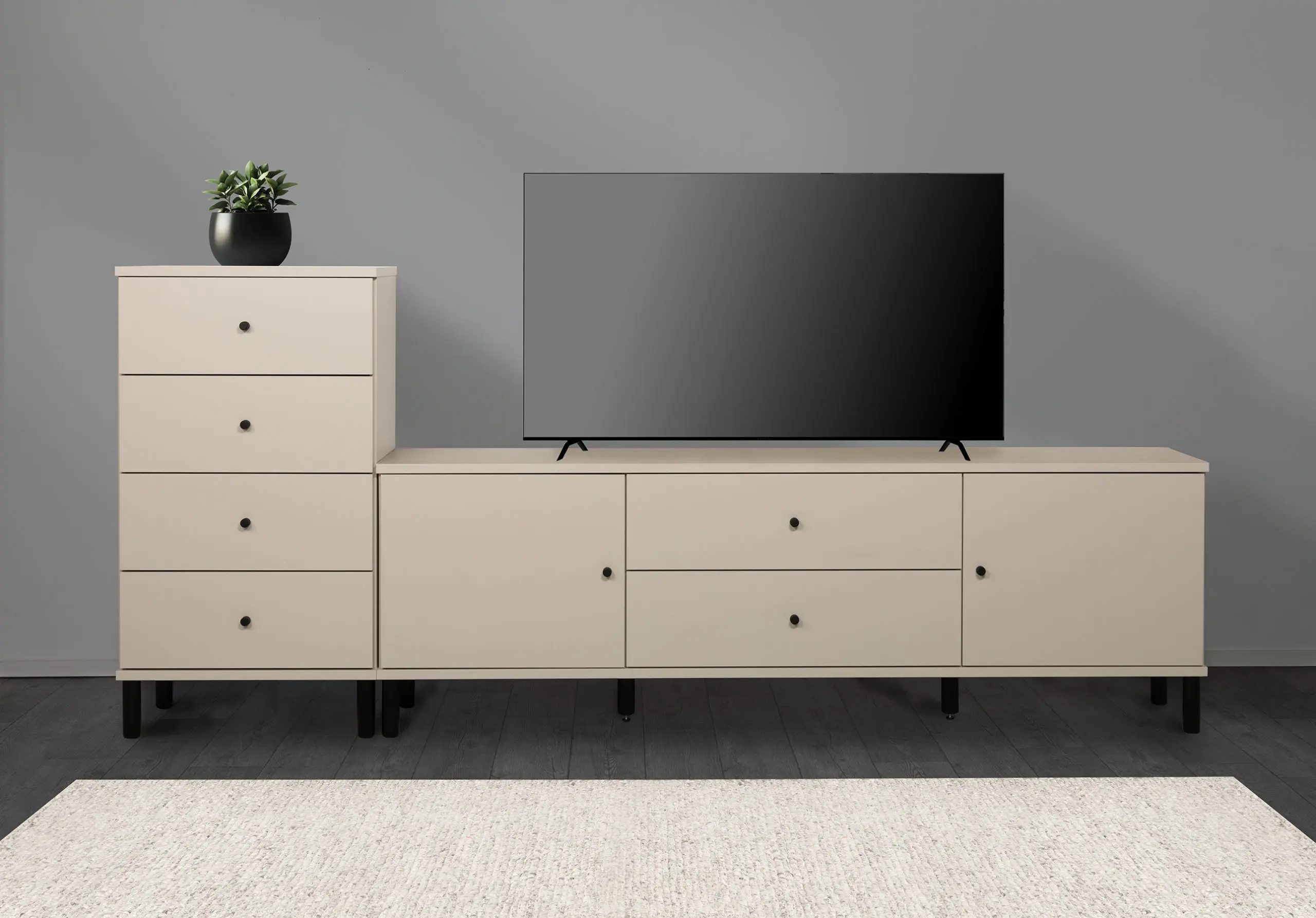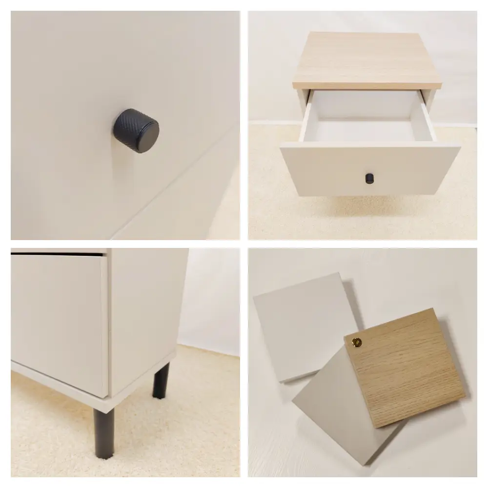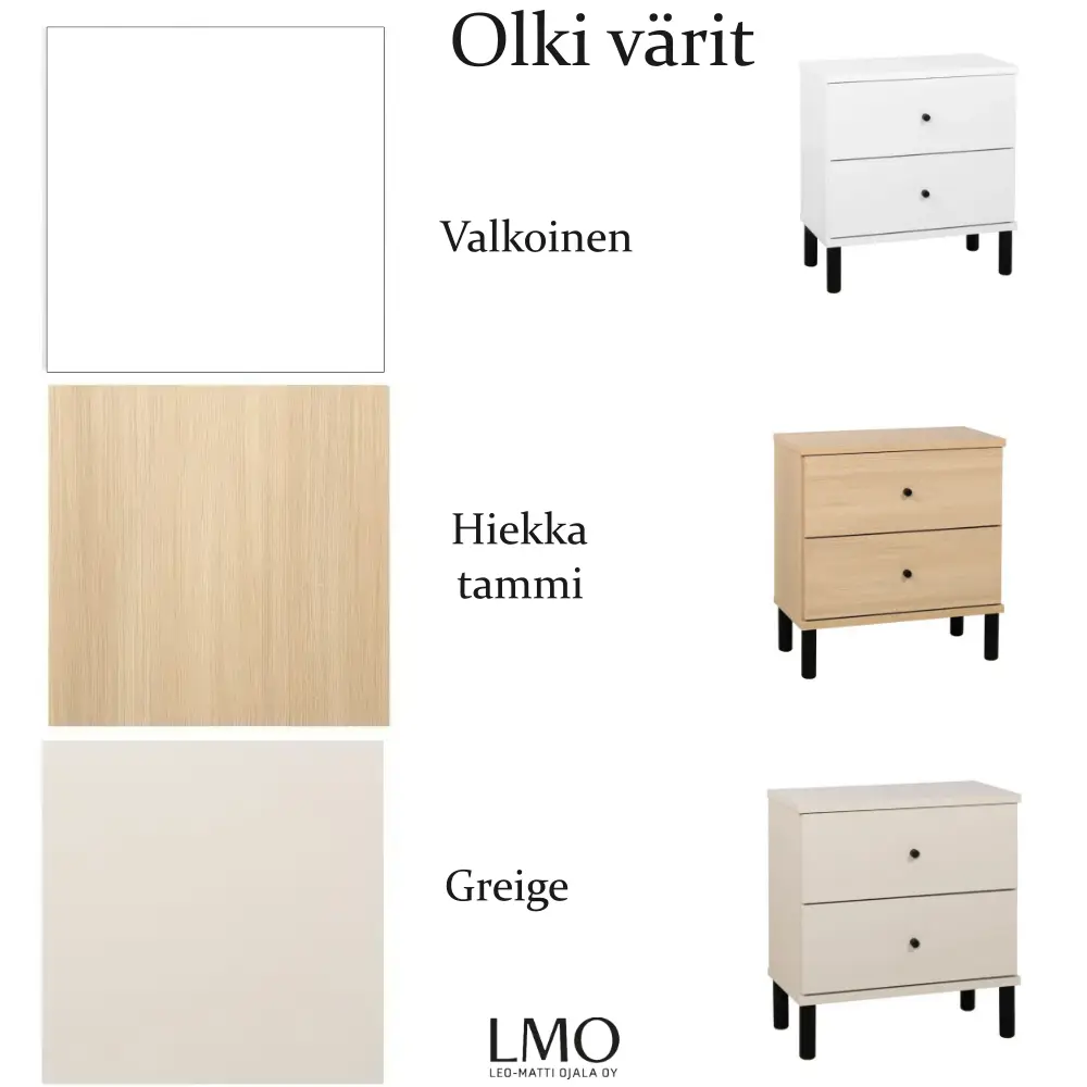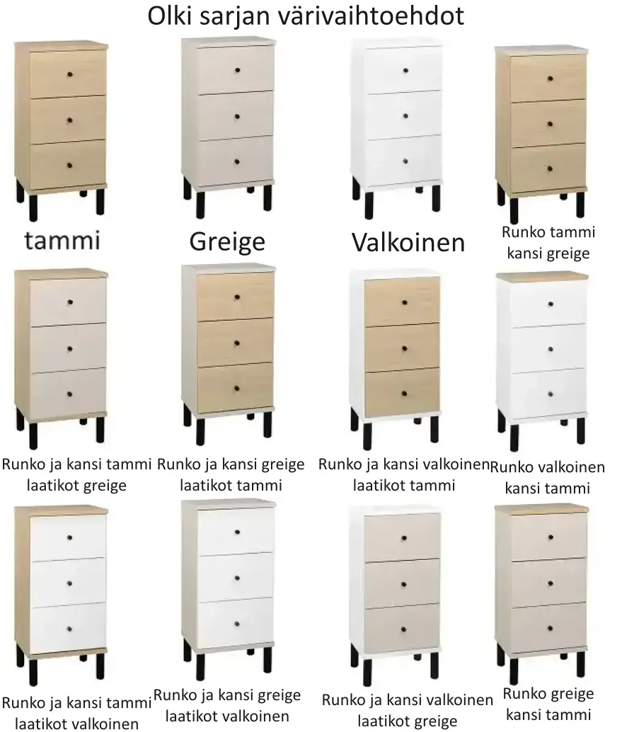 Olki-kalusteet tarjoavat laajat mahdollisuudet personointiin: rungon, kannen ja etusarjan väriksi voit valita valkoisen, hiekkatammen, greigen tai niiden yhdistelmän. Tyylikkäät mustat korkeat jalat ja mustat nuppivetimet viimeistelevät modernin ja elegantin ulkonäön. Kaluste toimitetaan runko koottuna – sinun tarvitsee vain kiinnittää jalat ja vetimet, ja se on heti käyttövalmis ilman stressaavaa kokoamista.