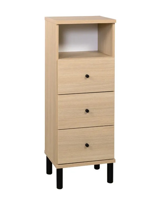 Kotimaisena laatutuotteena Olki-lipasto on tehty kestämään aikaa ja käyttöä. Sen leveys on 40,7 cm, ja se tarjoaa runsaasti säilytystilaa kolmen vetolaatikon ja avohyllyn avulla. Siron rakenteen ja korkean mustan jalan ansiosta taso näyttää kevyeltä ja tyylikkäältä, vaikka sen säilytyskapasiteetti yllättää positiivisesti. Tutustu muihin saman sarjan tuotteisiin