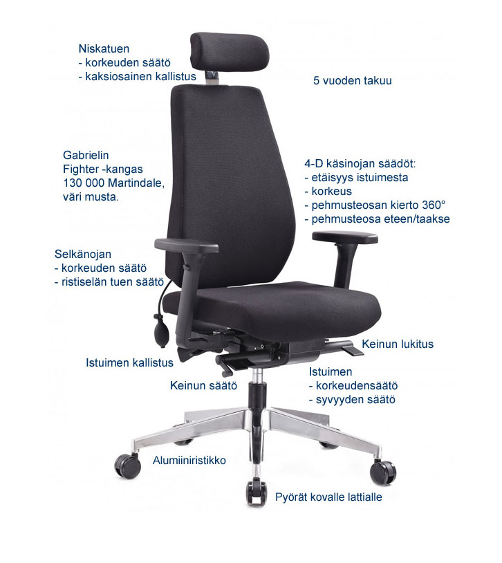 | 47 cm | 46 cm | 113-126 cm | 70 cm | cm | cm | cm | 46 cm | 47 cm | 46 cm | cm | cm | 43 cm | 54 cm | 10 cm | cm | cm | cm | cm | cm | cm | cm | cm | cm | cm | cm | cm | cm | Musta | cm | Painoraja 110 kg | Takuu 2 vuotta | Tilaustuote | kg | Kaukoitä | cm | cm | cm | 4D käsinojat jossa käsinojien leveyden ja korkeuden säätö, Istuinkaltevuuden säätö, istuinsyvyyden säätö, Korkeuden säätö kaasujousella, painon mukaan säädettävä keinuvastus, Selkänojan korkeudensäätö, Säädettävä ilmatäytteinen ristiseläntuki, vapaasti pyörivät pyörät | Verhoilu Fighter, kulutuskestävyys 130 000 martindale |