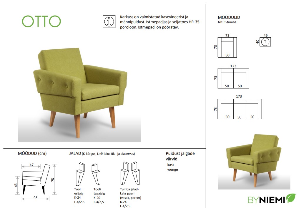 | 73 cm | 73 cm | 78 cm | cm | cm | cm | cm | 46 cm | 50 cm | 47 cm | 24 cm | cm | cm | cm | cm | cm | cm | cm | Istuimissa zigzag jousitus, istuintyyny vaahtomuovi 35HR, Jämäkkä istuintyyny | cm | cm | cm | cm | cm | cm | cm | cm | cm | cm | Cinema kangas, Suma kangas, Sundsvall kangas | Massiivipuu, Vaneri | Tammi, Wenge | cm | kg | cm | cm | cm |