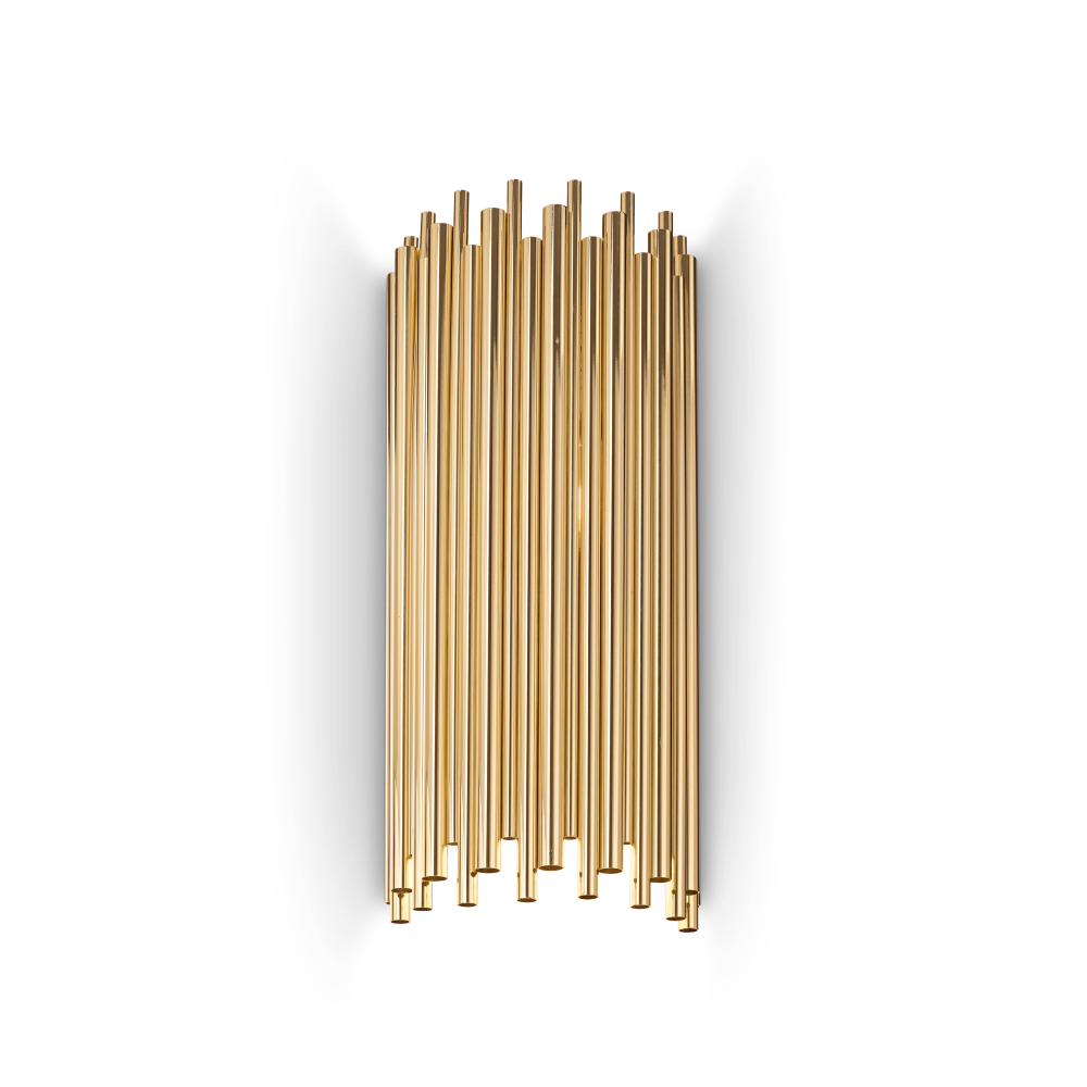 Tyylikäs Pan AP2 seinävalaisin on näyttävä design-valaisin, jossa eripituisista metalliputkista muodostuva varjostin luo voimakkaan ja arkkitehtonisen ilmeen. Kullan sävyinen metallipinta tuo tilaan arvokkuutta ja tekee valaisimesta katseenvangitsijan niin olohuoneeseen, portaikkoon kuin edustavaan käytävätilaan.