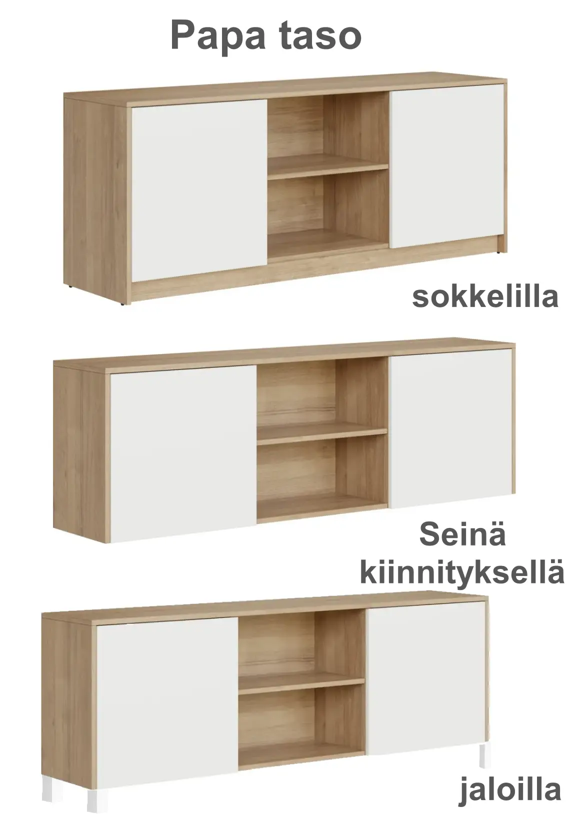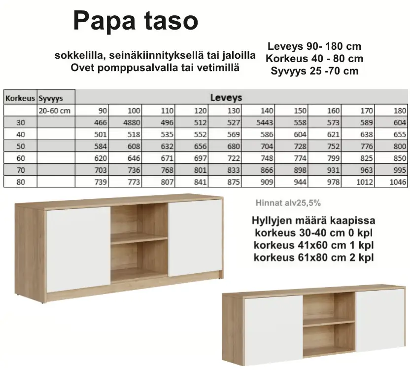 Papan korkealaatuinen, Suomessa valmistettu taso, joka mukautuu täydellisesti tarpeisiisi. Valitse leveys, syvyys ja korkeus sentin tarkkuudella – halutessasi jopa millimetrin välein. Tyylikkäässä tasossa on 2 kaappia jossa vakiona säädettävä hylly (60 cm ja sitä korkeammissa kaapeissa 2) ja avohylly, ja lisähyllyjä voi tilata.
