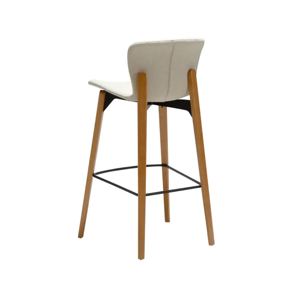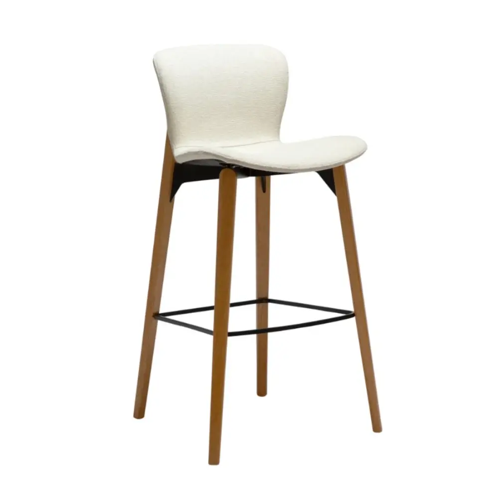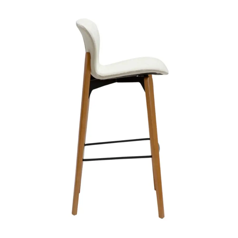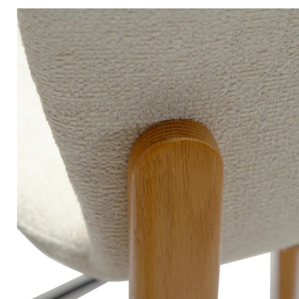 Pehmustettu istuin, verhoiltuna tyylikkäällä valkoisella bouclé-kankaalla, tarjoaa miellyttävän ja tukevan istumakokemuksen. Pulverimaalatut metallijalat takaavat vakauden ja pitkäikäisyyden, ja tarkkaan viimeistellyt yksityiskohdat tekevät tästä baarituolista sekä käytännöllisen että esteettisesti vaikuttavan valinnan.