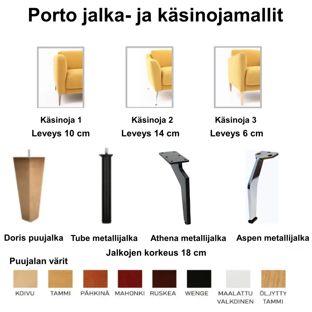 laadukkaat pehmusteet jotka takaavat erinomaisen istuintuntuman. Tuolin istuintyynyt ovat kiinteät. Portoon on saatavana kolme erilaista käsinojaa – kuvassa käsinoja 1 ja tuolin leveys on tällöin 200 cm. Jalat saatavana joko metallisena tai puisina. Porto sarjasta on saatavana 2 ja 3 kolmen istuttavaa sohvaa, rahia tai divaanisohvaa. Sohvaan tai tuoliin on saatavana käsinojasuojapari, joka toimitetaan samalla kankaalla kuin itse sohvakin.